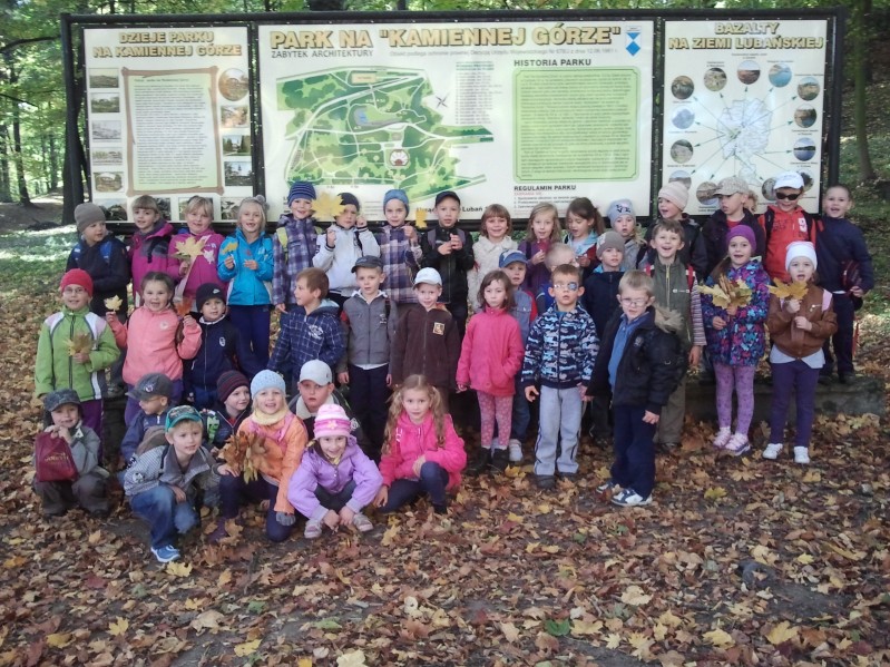Dnia 19.10.12r. dzieci 5 i 6-letnie wybrały się na spacer do parku "Kamienna Góra" malowniczego miejsca, szczególnie o tej porze roku - jesień. Dzieci były zachwycone widokiem parku w barwach jesiennych. Podziwiały wygląd drzew (pomniki przyrody), obserwowały ptaki. Dużą frajdą dla dzieci był odpoczynek na ławeczkach w parku. Największą atrakcją były zabawy w parku.
