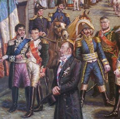Dzieło przedstawia cesarza przy ozdobnym portalu budynku dawnej Szkoły Ceglarskiej (ulicy Richterstrasse 2, obecnie Spółdzielcza) w otoczeniu lubańskich rajców i mieszczan. Miejscowi notable udają radość z przybycia Napoleona, natomiast ubodzy mieszkańcy stojący w oddali są niezadowoleni z wizyty Cesarza. W tle widzimy rynek z ówczesną zabudową, a w oddali wieżę kościoła. W obrazie dominują barwy jasne, optymistyczne.Wzrok przyciągają zindywidualizowane postacie, konie, galowe mundury, barwne stroje mieszczan oraz detale architektoniczne.