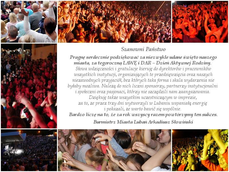 Szanowni Państwo, pragnę serdecznie podziękować za niezwykle udane święto naszego miasta, za tegoroczną LAWĘ i DAR – Dzień Aktywnej Rodziny.