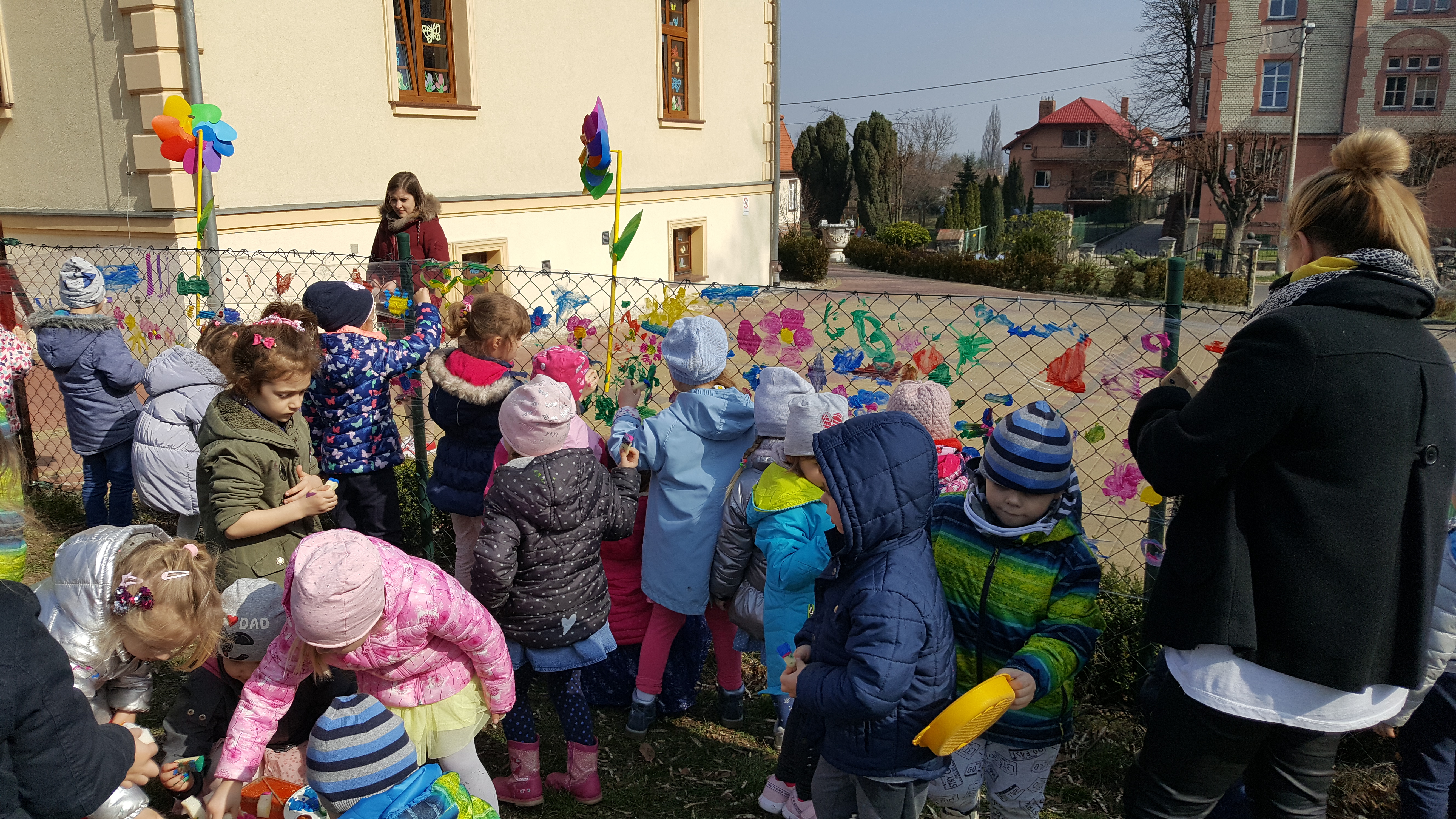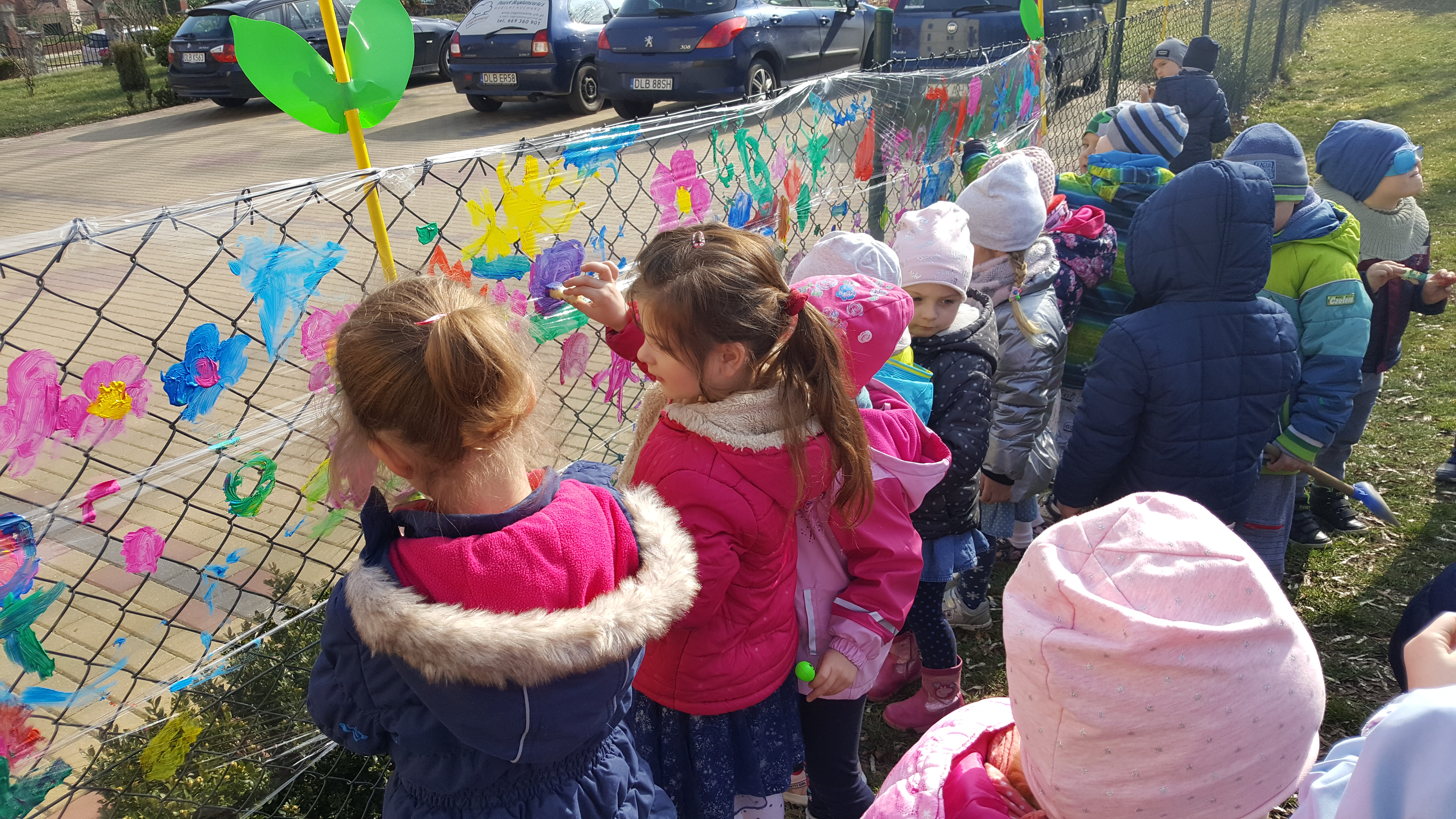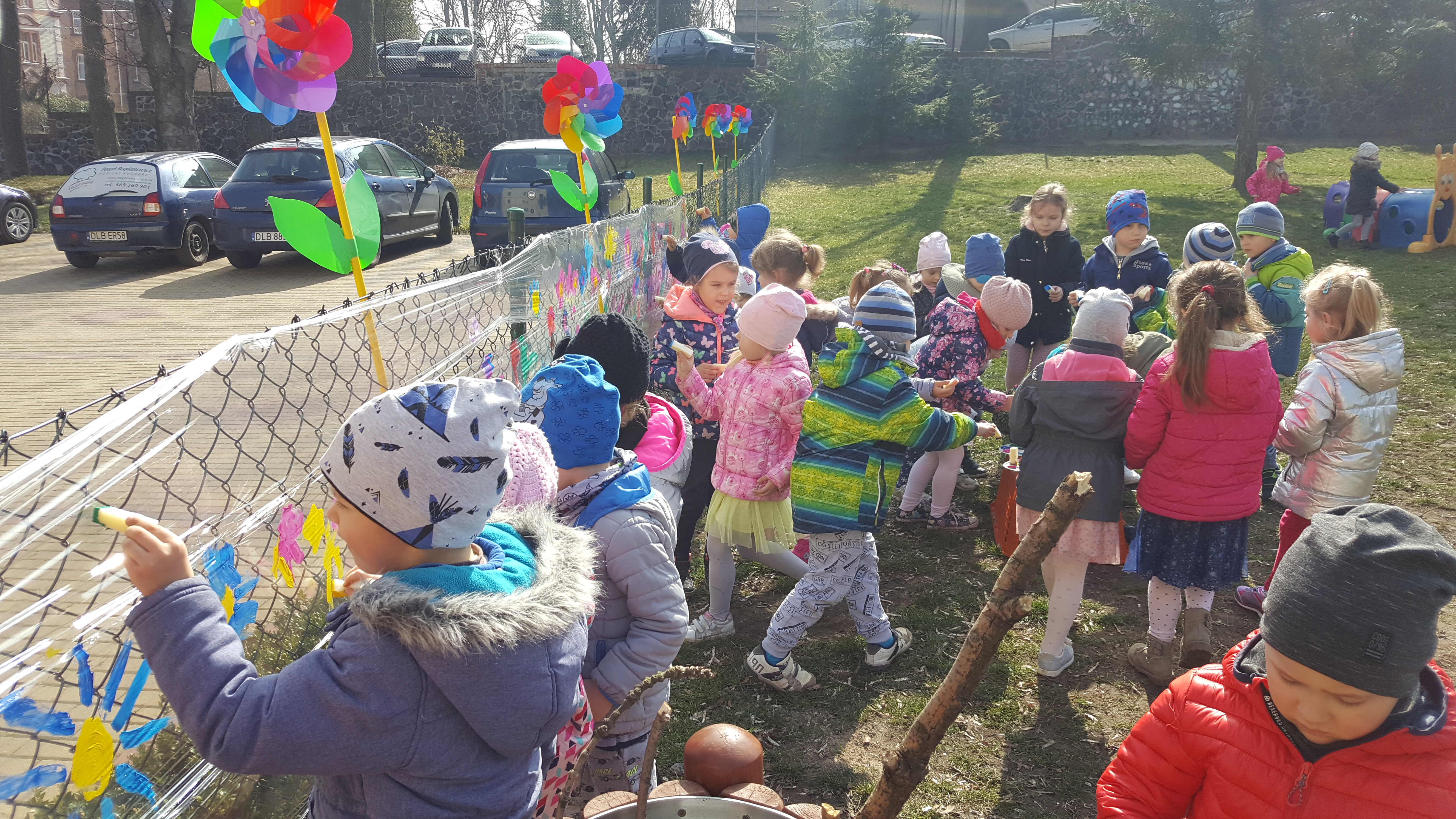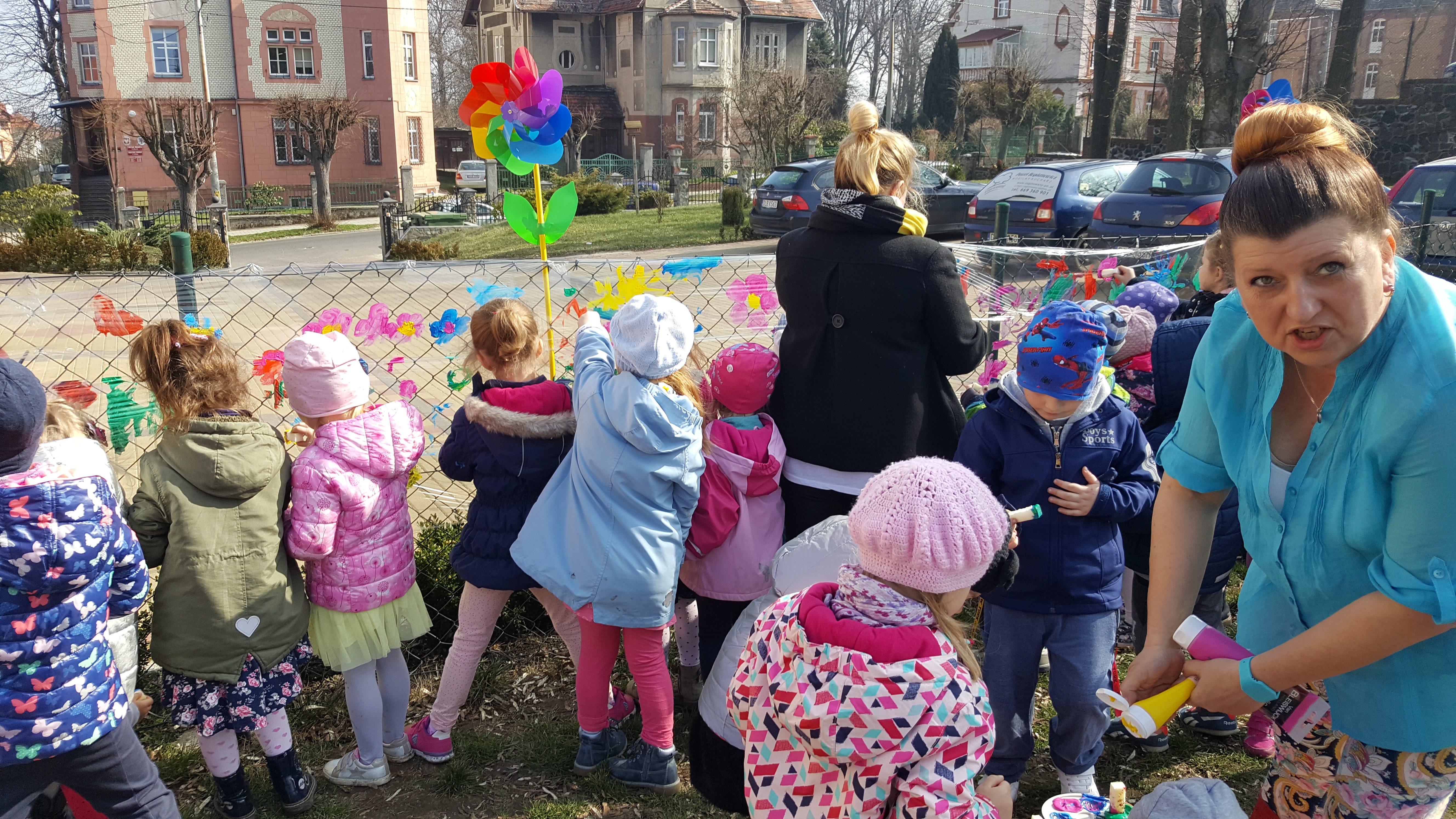Następnie kolorowe pochody ruszyły do lubańskich instytucji, wręczając pracownikom i mieszkańcom miasta własnoręcznie wykonane wiosenne kartki. Słońce radośnie do nas mrugało... Na drugi dzień wiosny dzieci uczestniczyły w warsztatach plastycznych na placu przedszkolnym. Wykonywały witrażyk wiosenny.