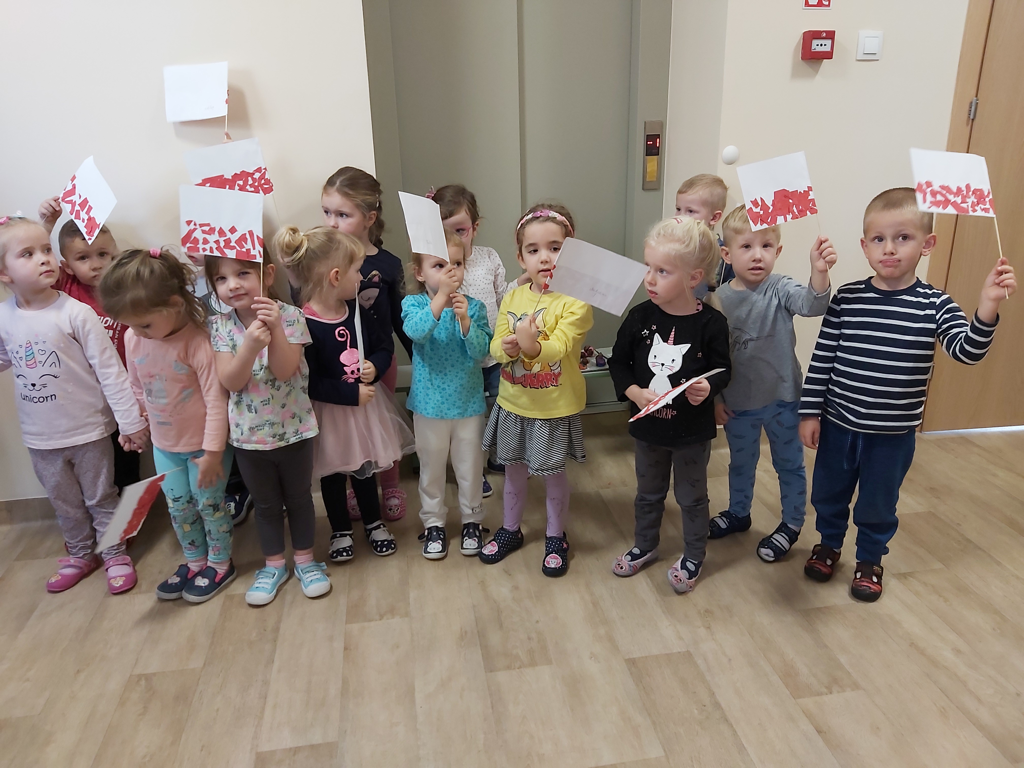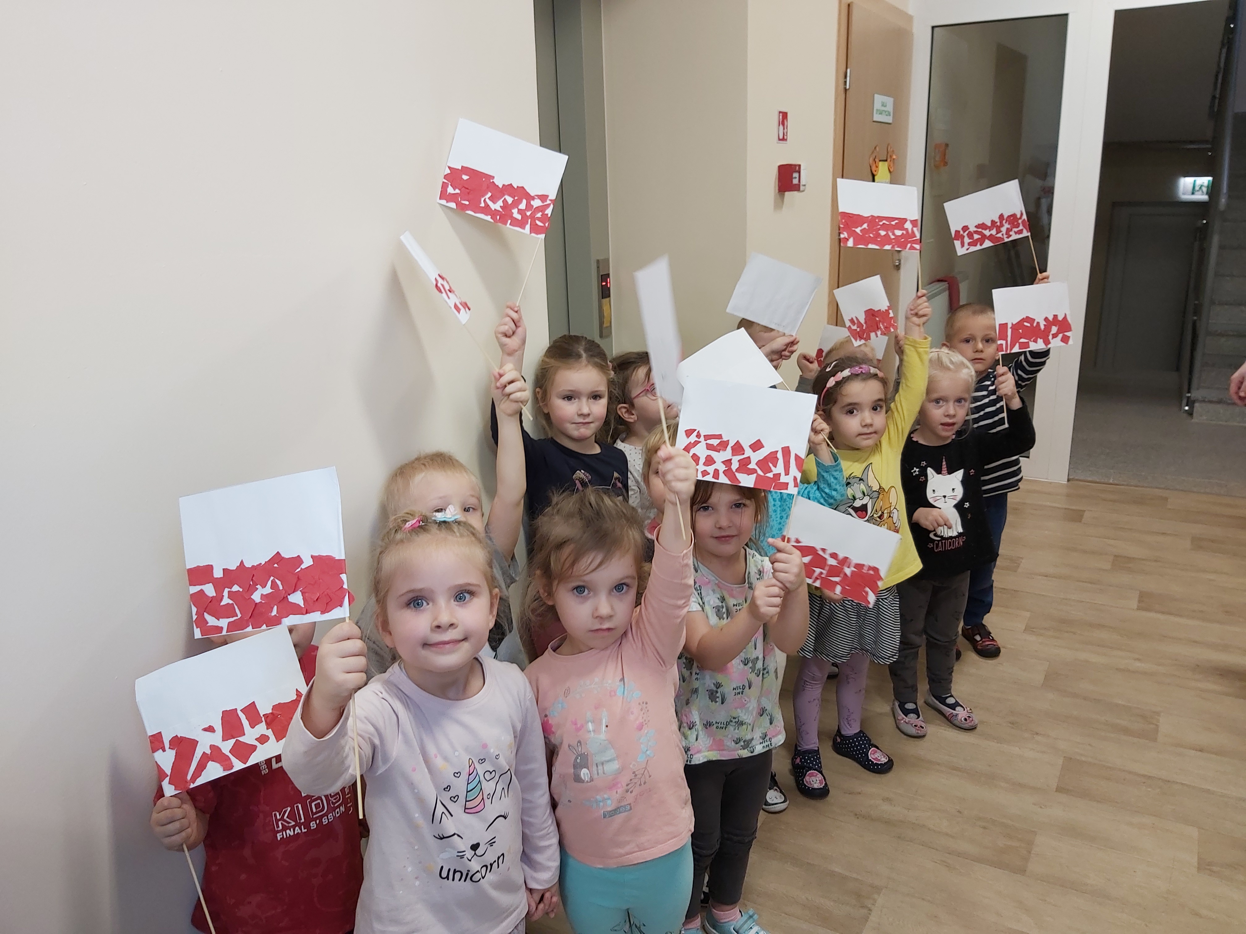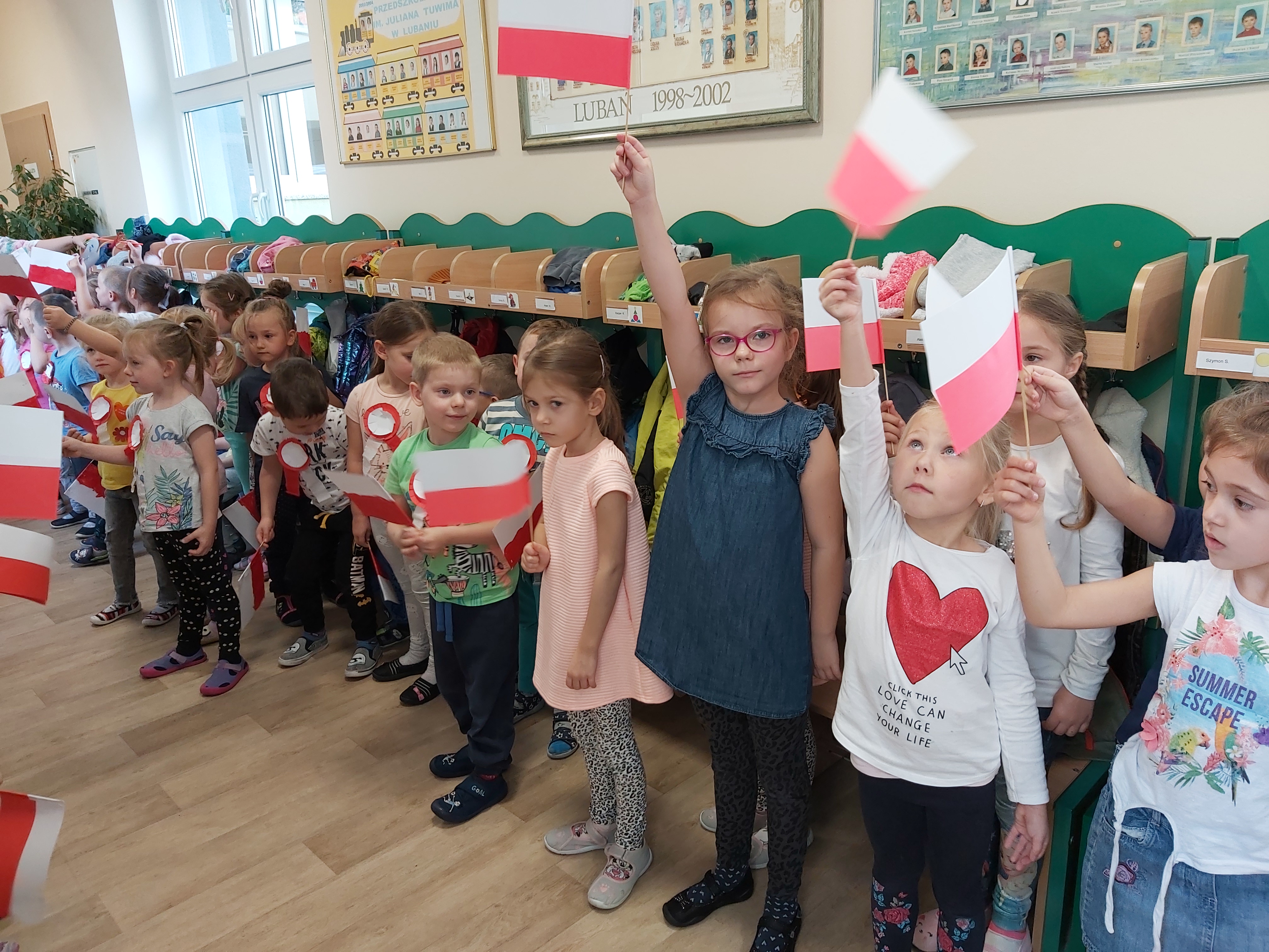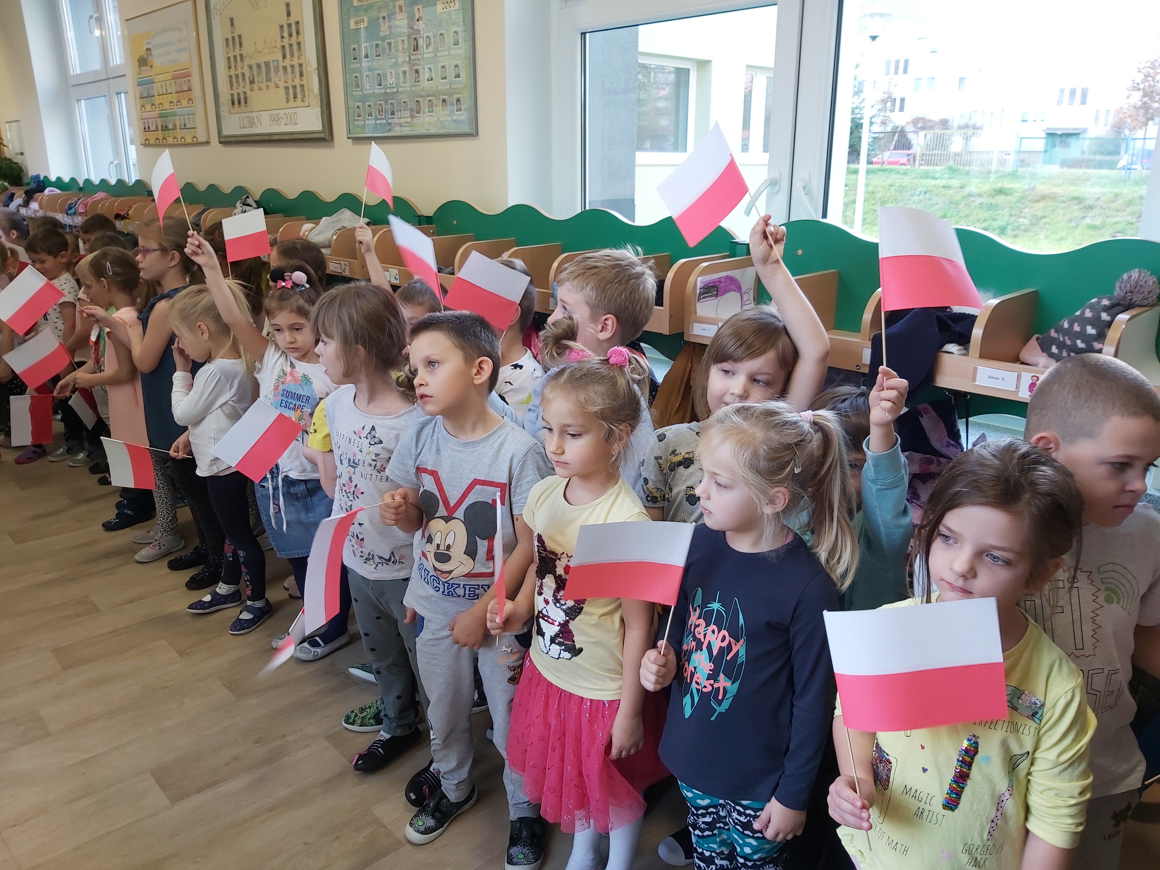 Dzieci z PM nr 5 im. J. Tuwima w Lubaniu obchodziły z dumą i powagą Narodowe Święto Niepodległości. Z tej okazji grupy przedszkolne zebrały się w holu przedszkolnym o godzinie 11.11, aby uroczyście odśpiewać hymn narodowy.