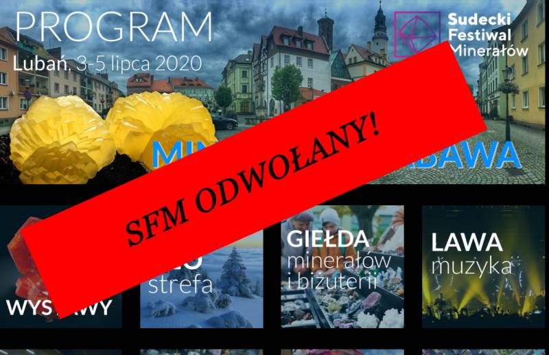 W obliczu rosnącego zagrożenia epidemiologicznego koronawirusem COVID-19, z przykrością informuję, w trosce o zdrowie i bezpieczeństwo uczestników imprez publicznych, że odwołuję wszystkie imprezy kulturalne, rekreacyjne, artystyczne, rozrywkowe, sportowe do końca lipca 2020 r., których organizatorem lub współorganizatorem miało być Miasto Lubań. Z uwagi na powyższe odwołany zostaje również Sudecki Festiwal Minerałów wraz z towarzyszącą mu LAWĄ 2020, który miał się odbyć w dniach 3-5 lipca 2020 r.