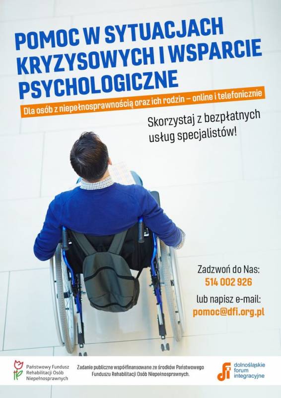 informujemy, że Stowarzyszenie Dolnośląskie Forum Integracyjne od stycznia 2021, w ramach projektu współfinansowanego ze środków PFRON pt. "Siła jest w Nas!", oferuje bezpłatną pomoc w sytuacjach kryzysowych oraz wsparcie psychologiczne dla osób z niepełnosprawnością z Dolnego Śląska oraz ich rodzin - online (za pomocą komunikatorów) oraz telefonicznie.