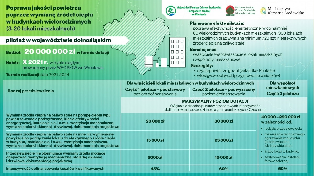 Na początku października bieżącego roku Ministerstwo Klimatu i Środowiska, Narodowy Fundusz Ochrony Środowiska i Gospodarki Wodnej oraz Wojewódzki Fundusz Ochrony Środowiska i Gospodarki Wodnej we Wrocławiu uruchomią na Dolnym Śląsku zapowiadany już trzeci z kolei pilotaż. Podobnie, jak w województwie zachodniopomorskim i w Pszczynie na Śląsku – ma on służyć poprawie jakości powietrza oraz zmniejszeniu emisji gazów cieplarnianych poprzez wymianę źródeł ciepła i poprawę efektywności energetycznej budynków mieszkalnych wielorodzinnych od 3 do 20 lokali mieszkalnych. Pilotaż programu, który prowadzony będzie przez WFOŚiGW we Wrocławiu, planowany jest na lata 2021-2024.