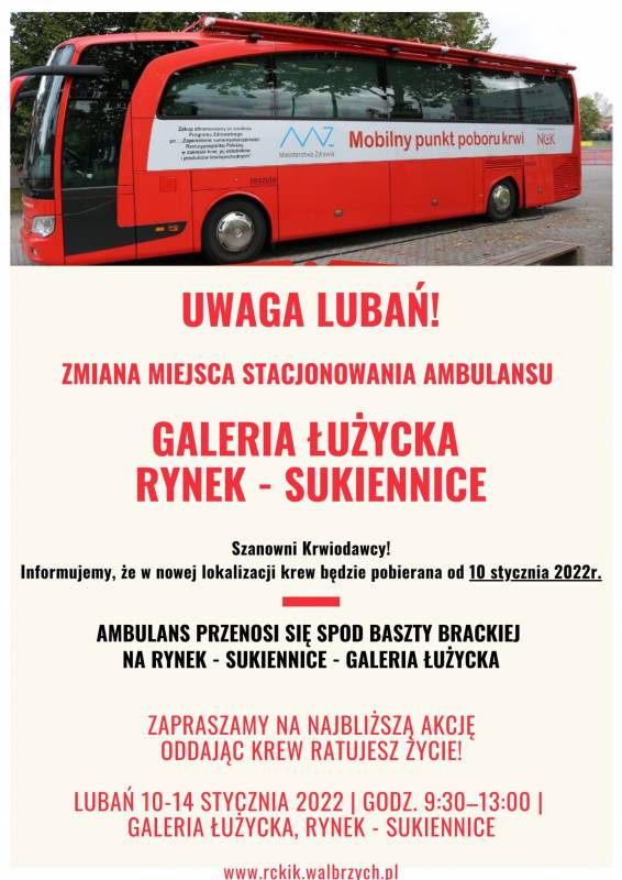 Informujemy, że ze względu na komfort i wygodę Krwiodawców od stycznia 2022 r. zostało zmienione miejsce stacjonowania Ambulansu, spod Wieży Brackiej na Rynek-Sukiennice - plac przy Galerii Łużyckiej.