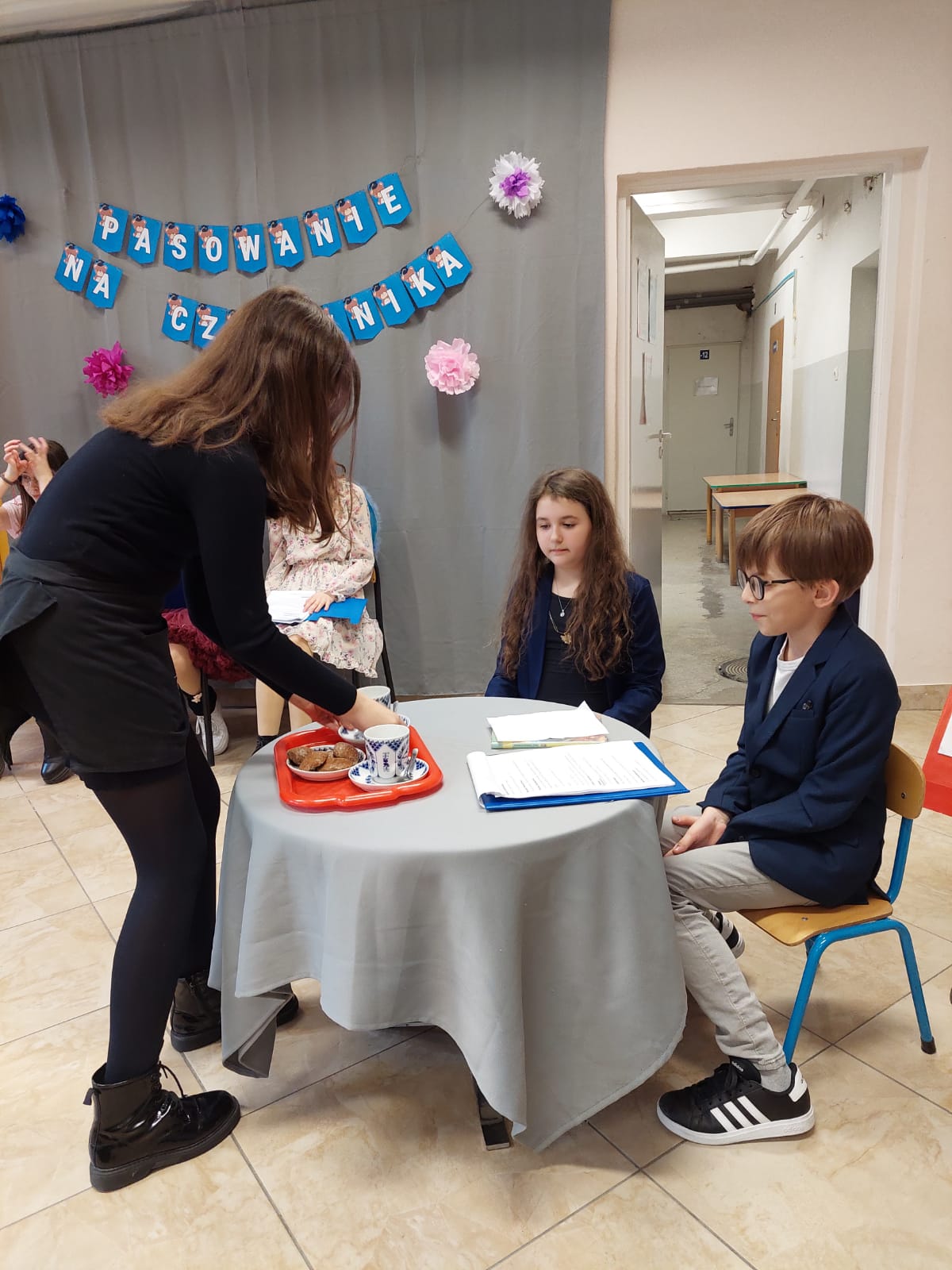 Zanim jednak pierwszoklasiści złożyli obietnicę, że książki będą kochać i szanować, uczestniczyli w interaktywnej inscenizacji pt. ,,Jak powstają książki”. Po przyrzeczeniu pani Kasia ogromną księgą dokonała pasowania. Od tego momentu uczniowie klas I stali się pełnoprawnymi czytelnikami biblioteki szkolnej. Następnie wróżki z kl. 6b i 5b wręczyły naszym czytelniczym nowicjuszom upominki, którymi obdarował ich Instytut Książki w ramach kampanii „Mała książka – wielki człowiek”. Każde dziecko otrzymało również zakładkę do książki i list do rodziców.