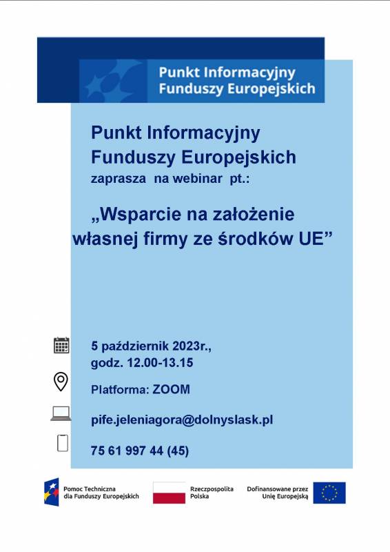 Punkt Informacyjny Funduszy Europejskich w Jeleniej Górze zaprasza 5 października na webinarium „Wsparcie na założenie własnej firmy ze środków UE”. W trakcie spotkania informacyjnego on-line zostaną przedstawione możliwości otrzymania wsparcia finansowego na uruchomienie własnej działalności gospodarczej.