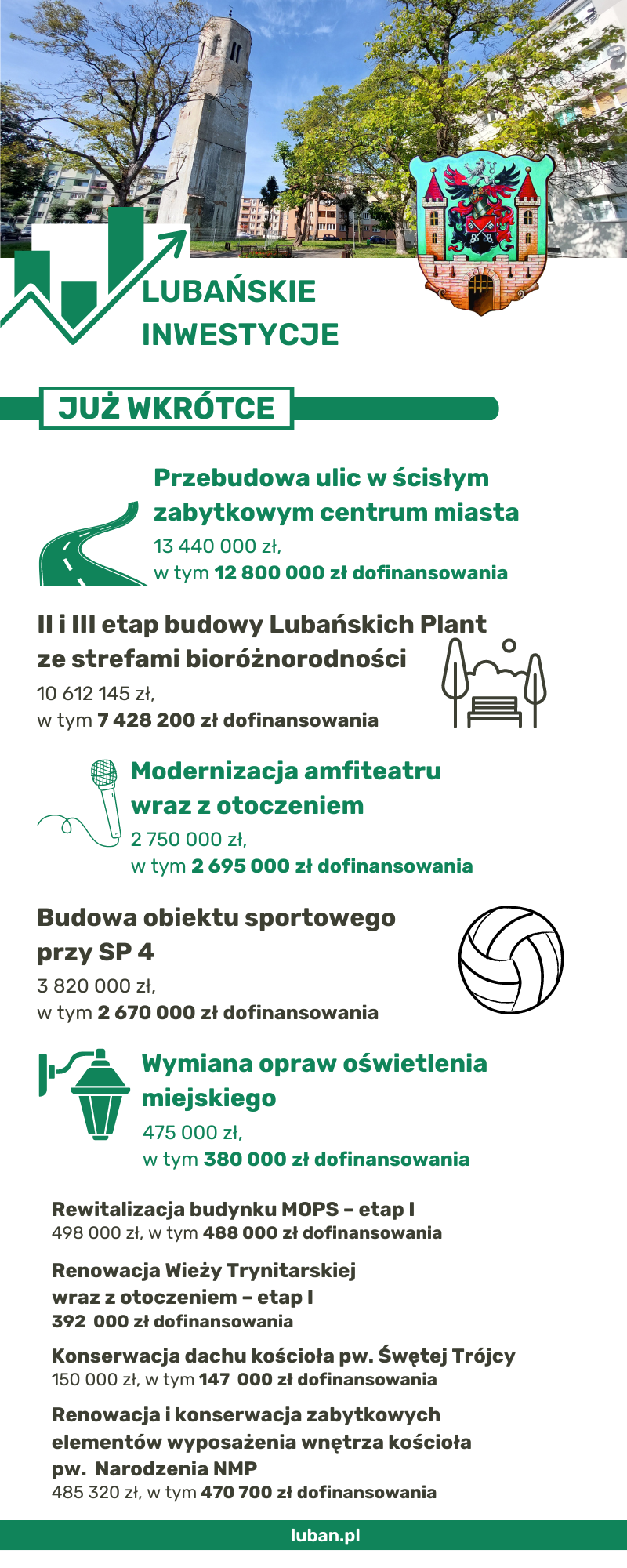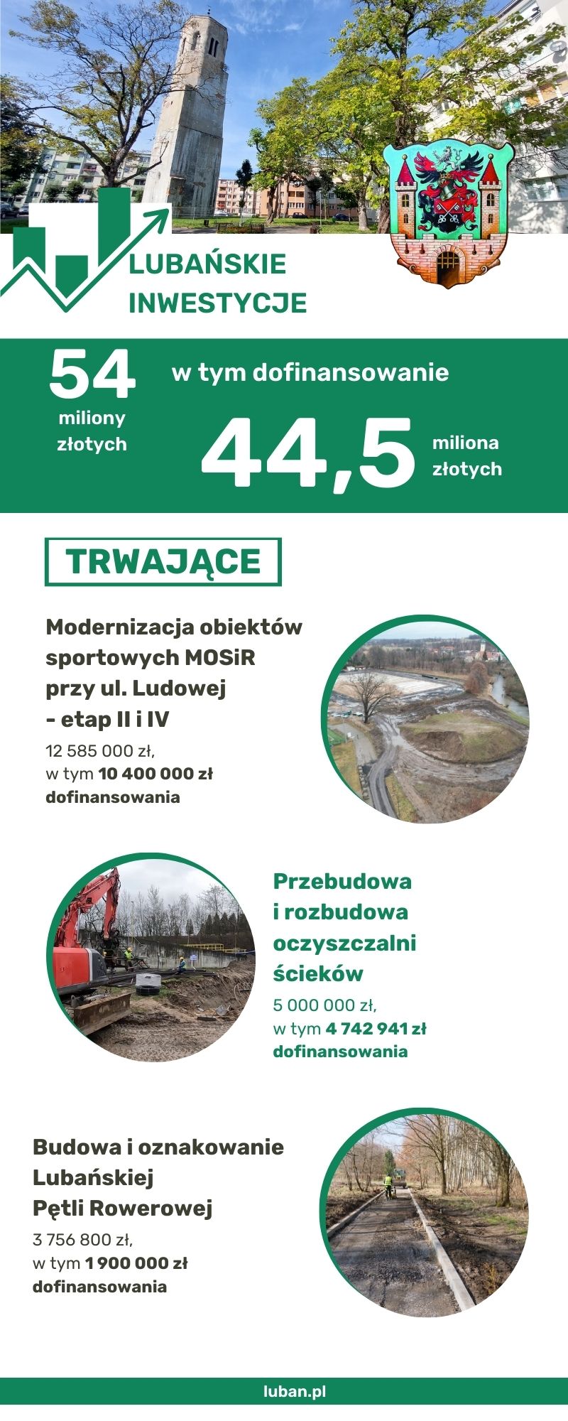 Gmina Miejska Lubań pozyskała środki na inwestycje, których realizacja już się rozpoczęła lub jest w trakcie przygotowań. Zadania te opiewają na przeszło 54 miliony złotych, z czego około 44 miliony złotych pochodzi z funduszy zewnętrznych.