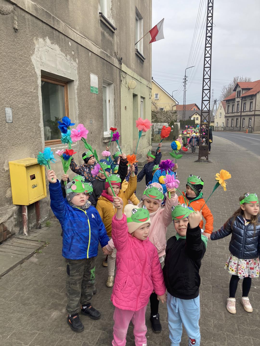Uroczystości powitania Wiosny rozpoczęły się od zabaw związanych z tematyką pór roku. Mimo wielu atrakcji najbardziej oczekiwaną częścią dnia było wyjście na spacer, podczas którego mogliśmy pożegnać zimę i powitać wiosnę. Dzieci radośnie maszerowały w wiosennym korowodzie, na czele którego widniała Marzanna, którą następnie pożegnaliśmy według tradycji.