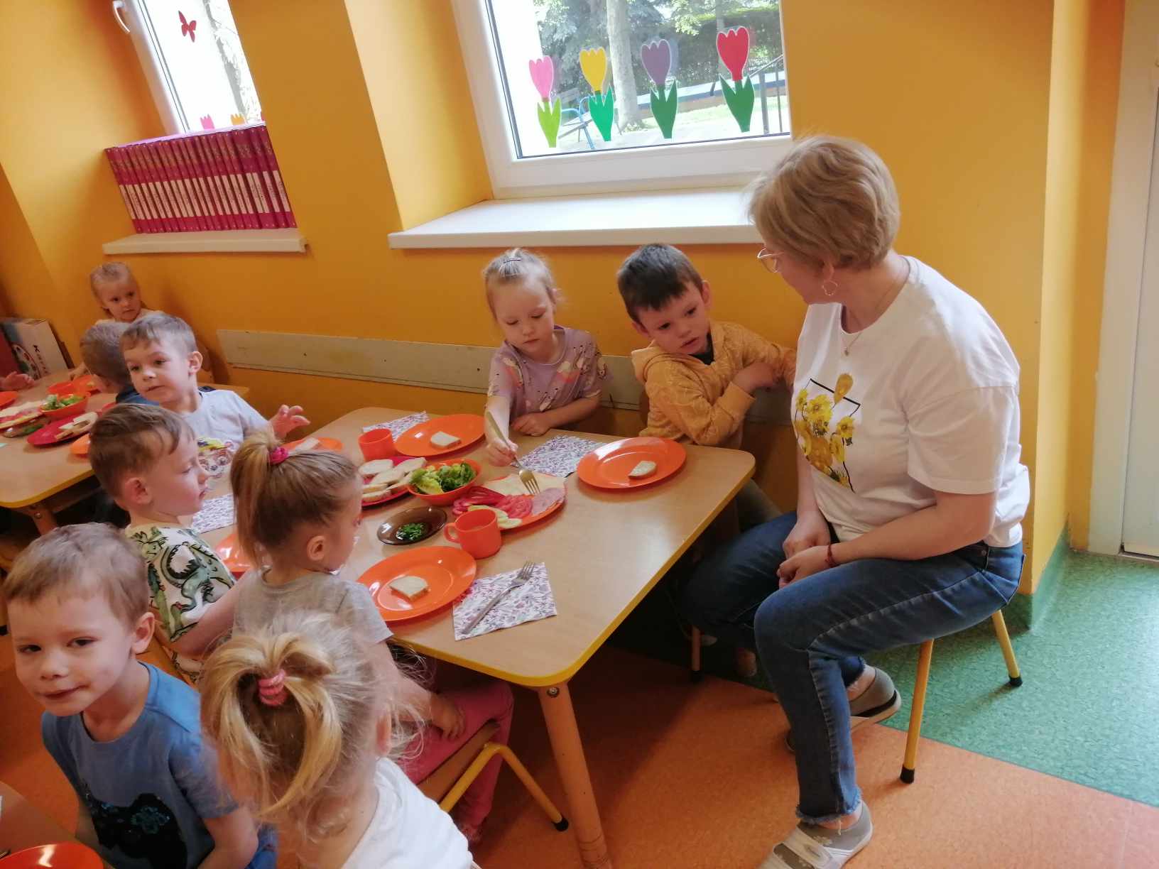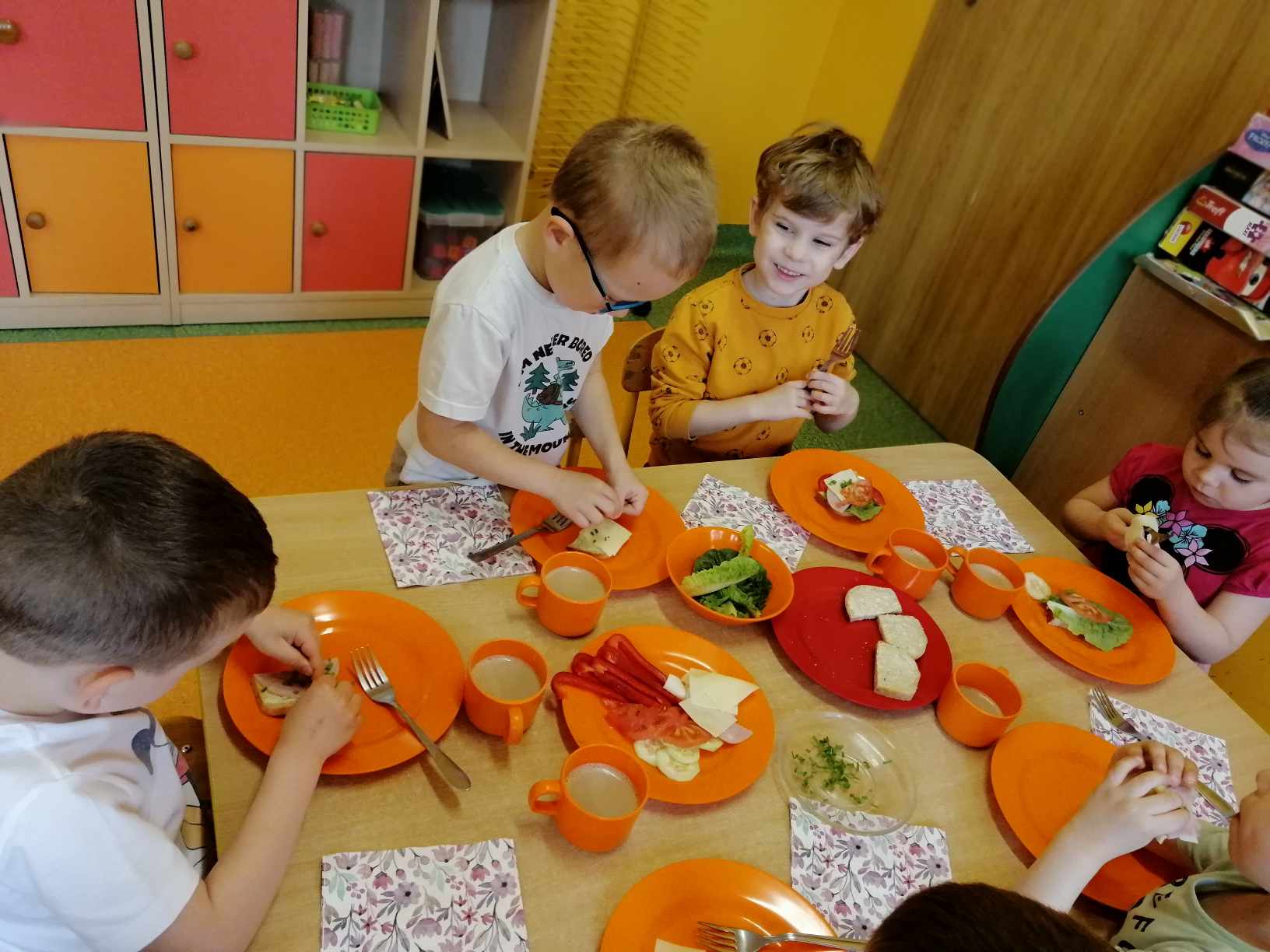 o higienę. Następnie odbyła się degustacja kanapek. Okazało się, że naszym milusińskim najlepiej smakowały te zrobione własnoręcznie, które wyglądały pięknie, kolorowo i zawierały mnóstwo witamin. Nawet największe niejadki zjadły swoje porcje z wielkim apetytem. Było bardzo, bardzo zdrowo, kolorowo, ale przede wszystkim smacznie!