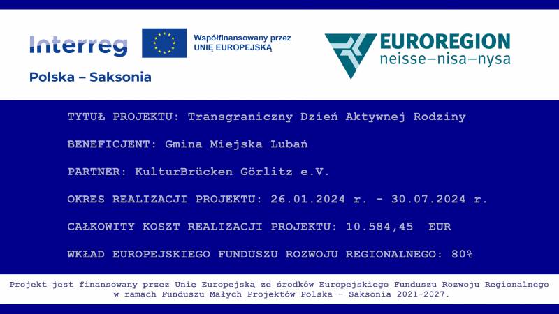 Gmina Miejska Lubań otrzymała dofinansowanie na realizację zadania pn. "Transgraniczny Dzień Aktywnej Rodziny" ze środków Europejskiego Funduszu Rozwoju Regionalnego w ramach Funduszu Małych Projektów Polska-Saksonia 2021-2027.