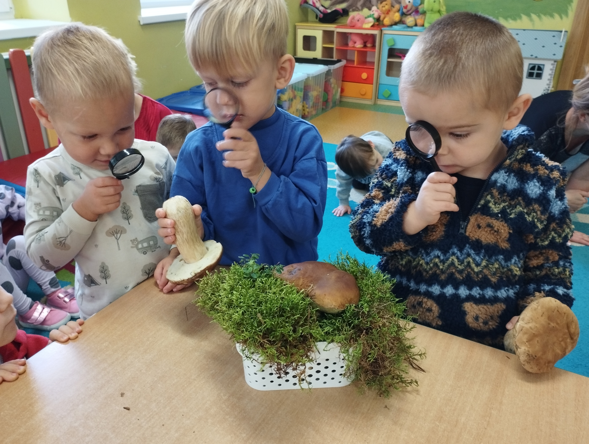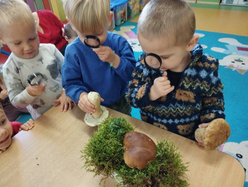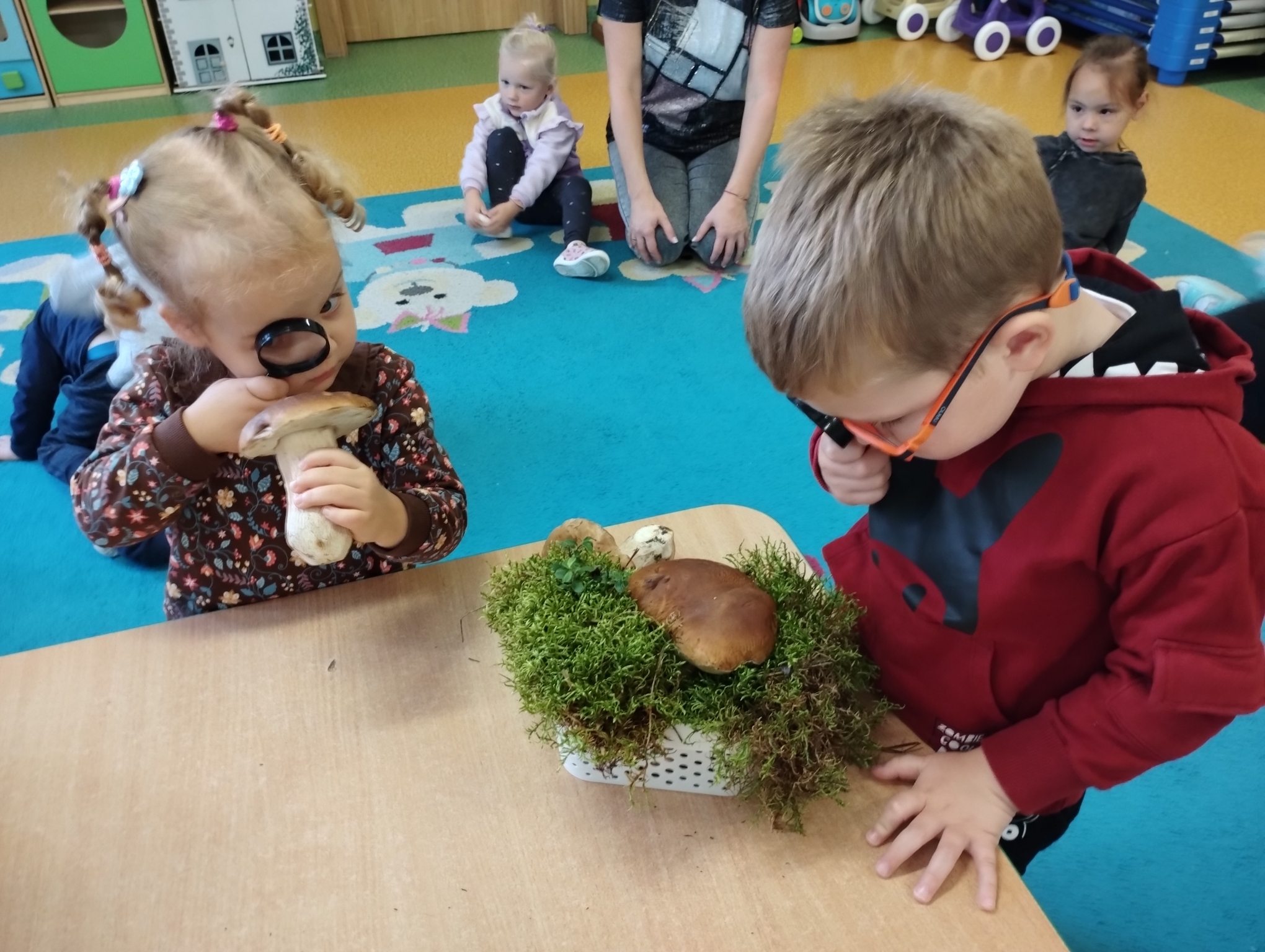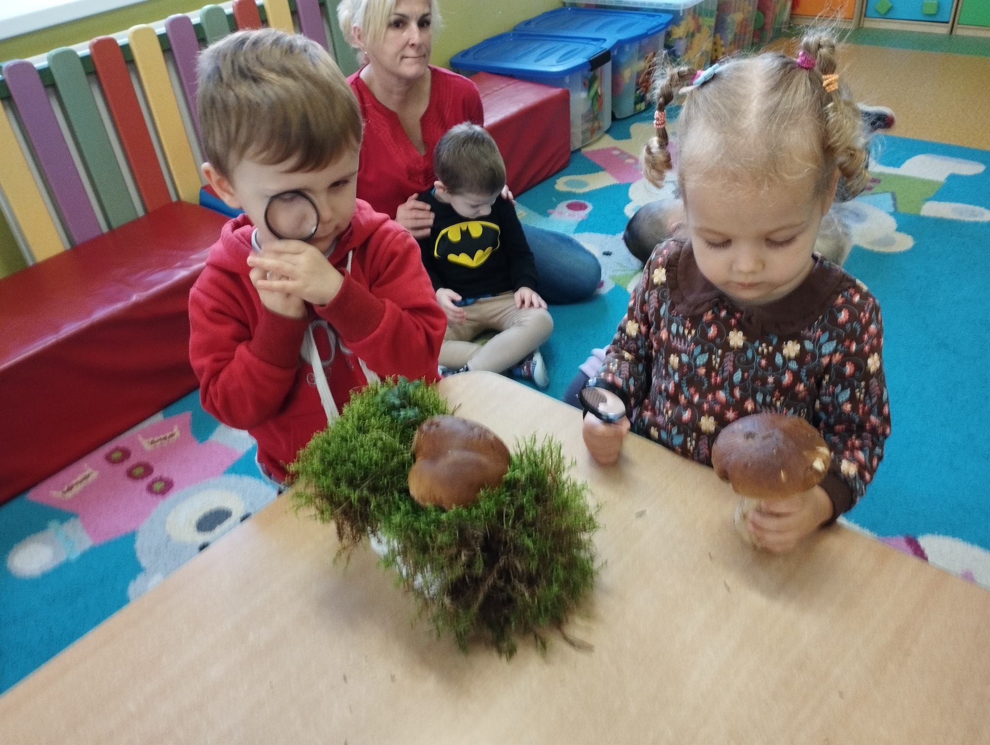 Październik to miesiąc,w czasie którego można obserwować przyrodę budzącą się do życia a szczególnie nas dziś zainteresowały pojawiające się w lesie grzyby. Dlatego podczas dzisiejszych zajęć przyrodniczych dzieci obserwowały grzyby. Trzeba przyznać, że były to prawdziwe leśne okazy. Dzięki lupom prowadziliśmy obserwacje grzyba w jego stworzonym w przedszkolu naturalnym środowisku.