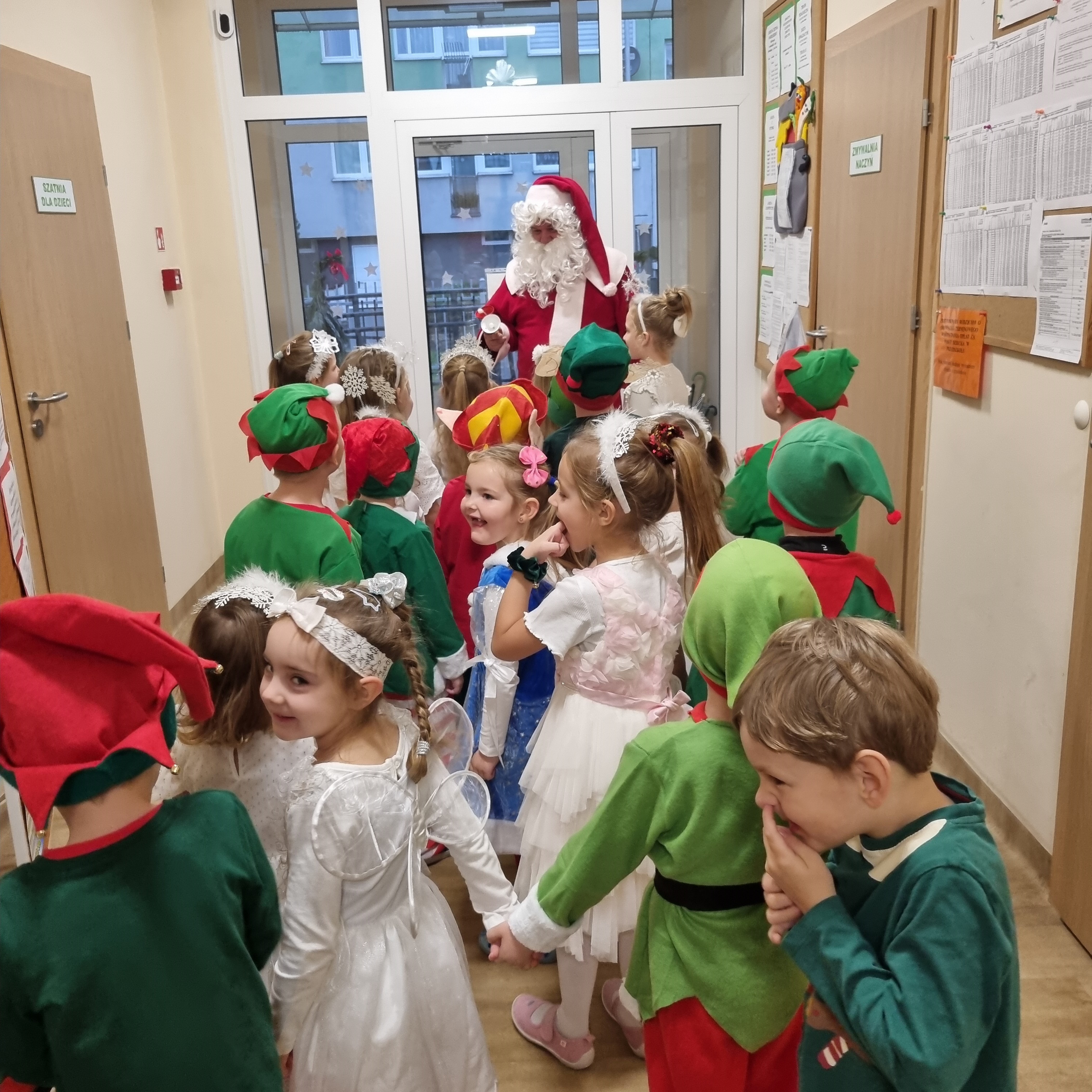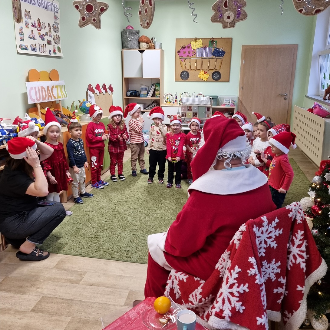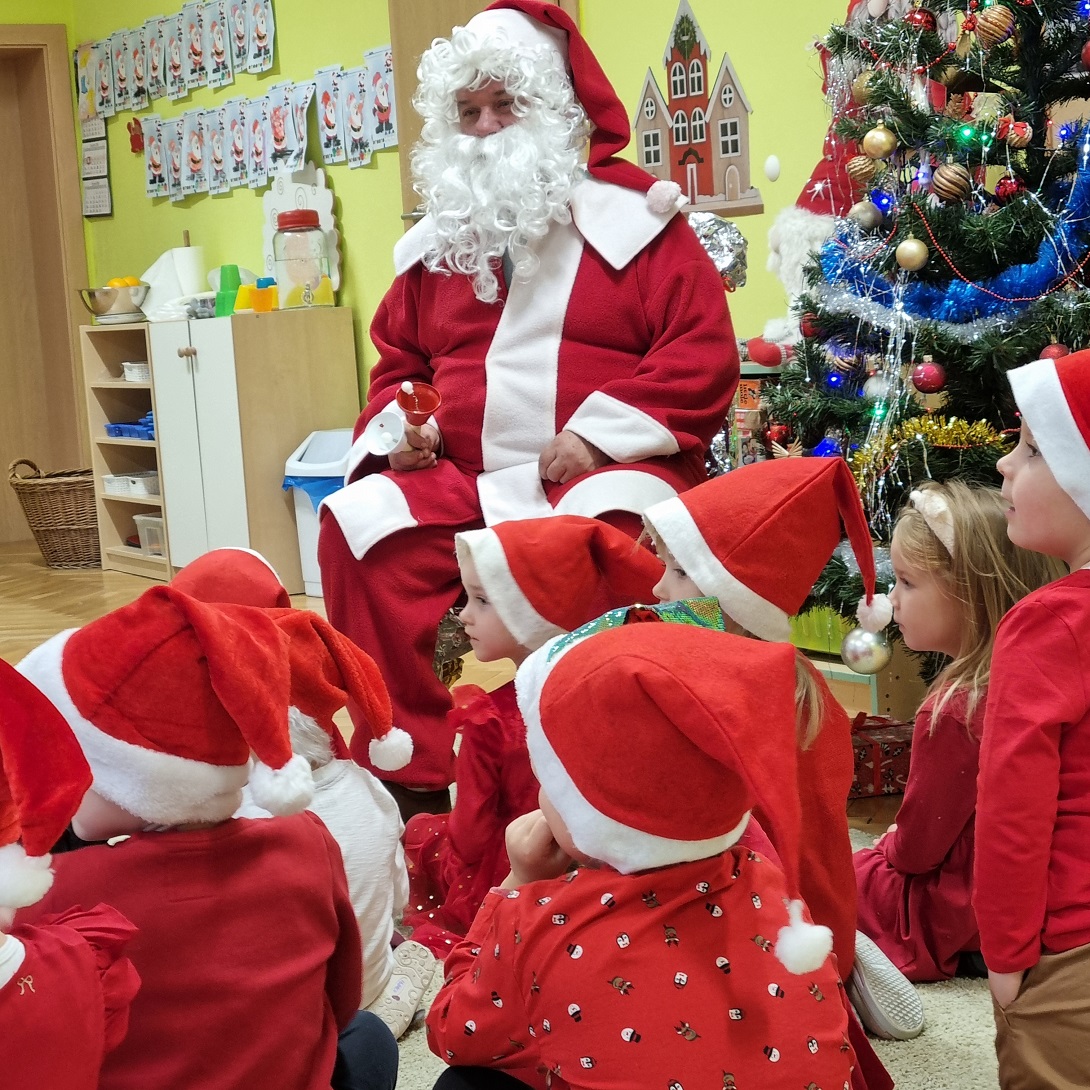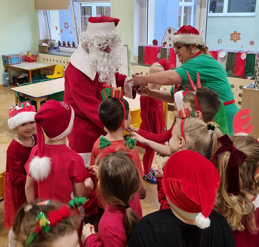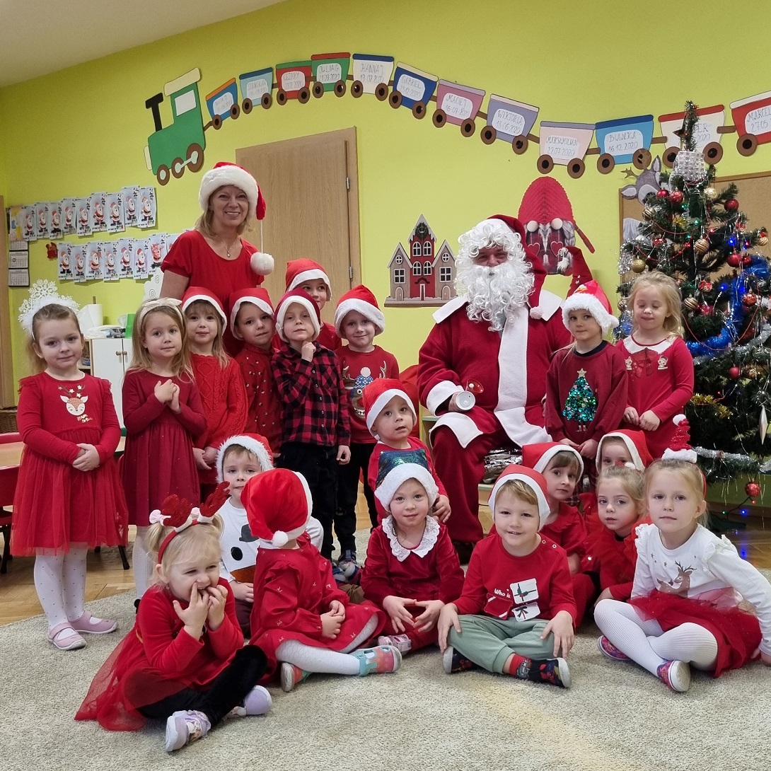 Chociaż nie było śniegu, jak co roku przybył na czas. Spotkanie przebiegało w radosnej atmosferze. Dzieci z grupy IV pod opieka pani Ani powitały niezwykłego gościai oprowadzały Mikołaja po przedszkolu. Wszystkie dzieci ubrały się na kolor czerwony, a głowy zdobiły mikołajowe czapki lub opaski świąteczne.Każda grupa przygotowała dla gościa muzyczną niespodziankę. Przedszkolaki starannie przygotowały się do wizyty Św. Mikołaja. W przedszkolu pisały lub rysowały listy, nauczyły się piosenek o Mikołaju, wykonywały prace plastyczne o tematyce świątecznej, ubierały choinkę, dekorowały salę, piekły pierniczki i wykonywały smakołyki cukierkowe.Na twarzach dzieci malował się uśmiech, przejęcie, a takze nadzieja na kolejne spotkanie. Św. Mikołaju bardzo dziękujemy za odwiedziny , podarki otrzymane od Ciebie bardzo nam podobają się. Dziękujemy za odwiedziny i do zobaczenia za rok...