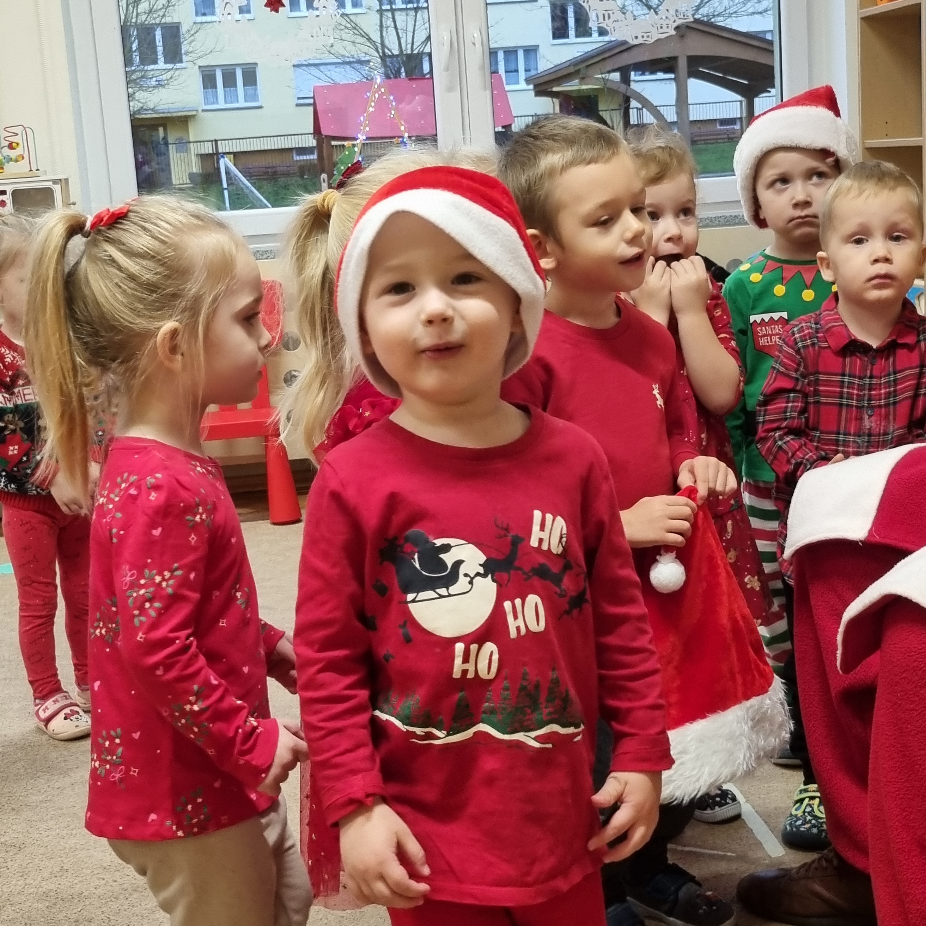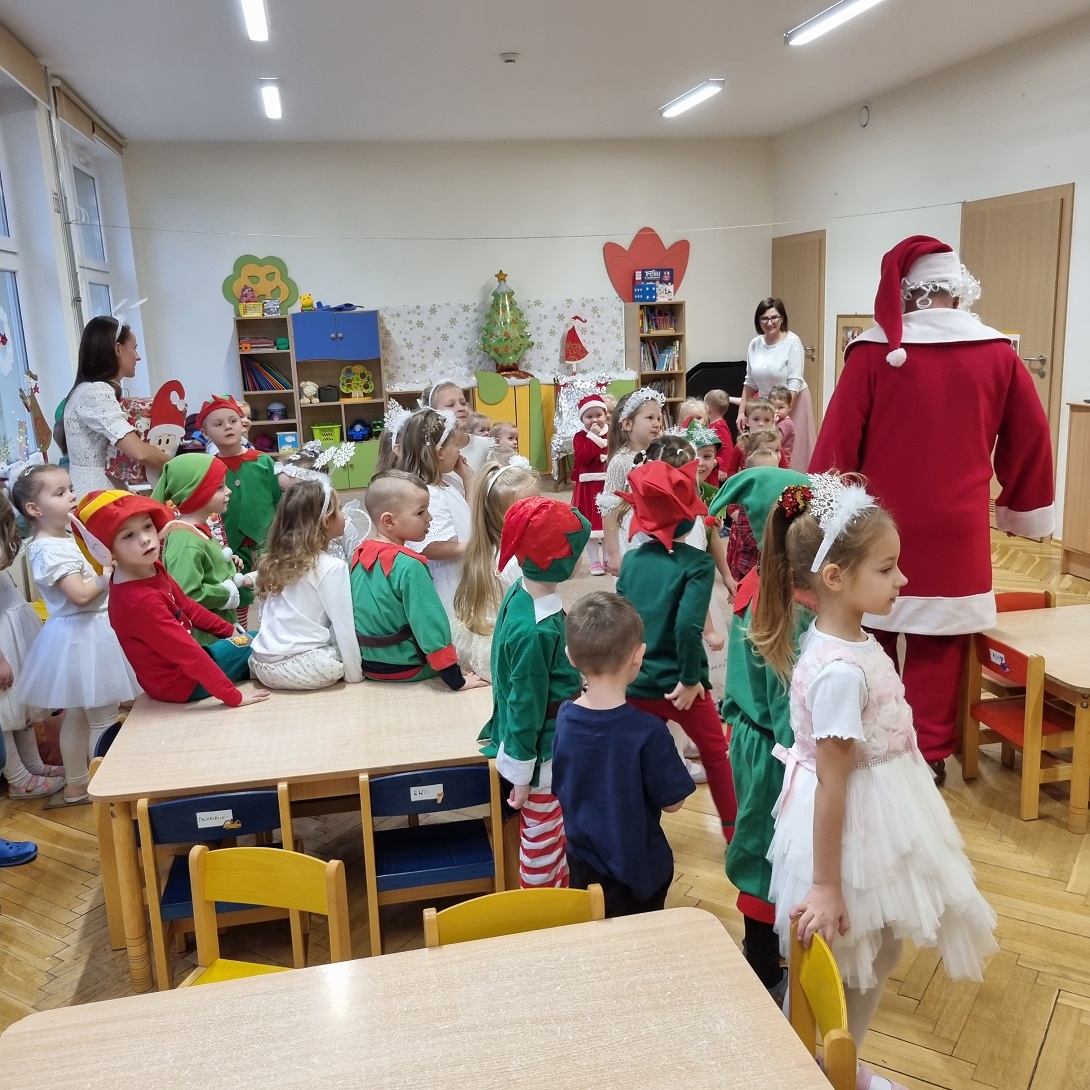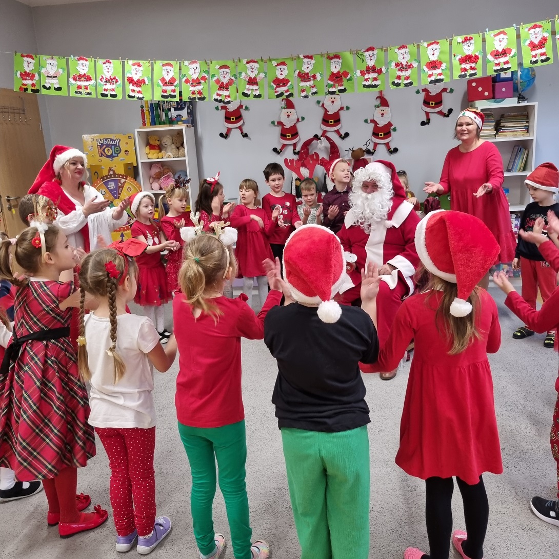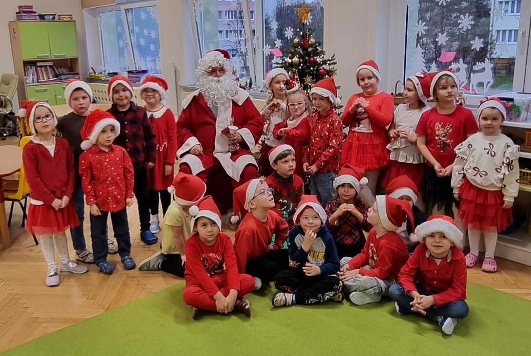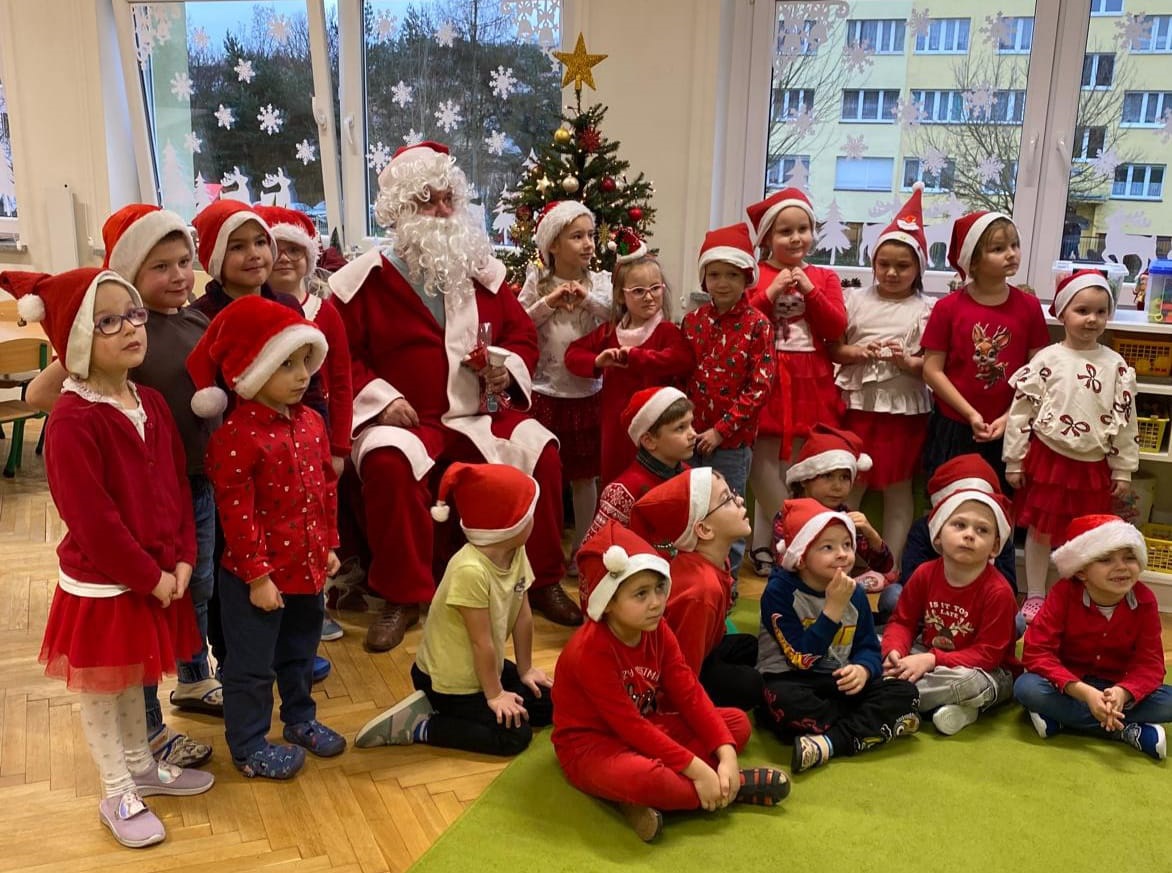 Chociaż nie było śniegu, jak co roku przybył na czas. Spotkanie przebiegało w radosnej atmosferze. Dzieci z grupy IV pod opieka pani Ani powitały niezwykłego gościai oprowadzały Mikołaja po przedszkolu. Wszystkie dzieci ubrały się na kolor czerwony, a głowy zdobiły mikołajowe czapki lub opaski świąteczne.Każda grupa przygotowała dla gościa muzyczną niespodziankę. Przedszkolaki starannie przygotowały się do wizyty Św. Mikołaja. W przedszkolu pisały lub rysowały listy, nauczyły się piosenek o Mikołaju, wykonywały prace plastyczne o tematyce świątecznej, ubierały choinkę, dekorowały salę, piekły pierniczki i wykonywały smakołyki cukierkowe.Na twarzach dzieci malował się uśmiech, przejęcie, a takze nadzieja na kolejne spotkanie. Św. Mikołaju bardzo dziękujemy za odwiedziny , podarki otrzymane od Ciebie bardzo nam podobają się. Dziękujemy za odwiedziny i do zobaczenia za rok...