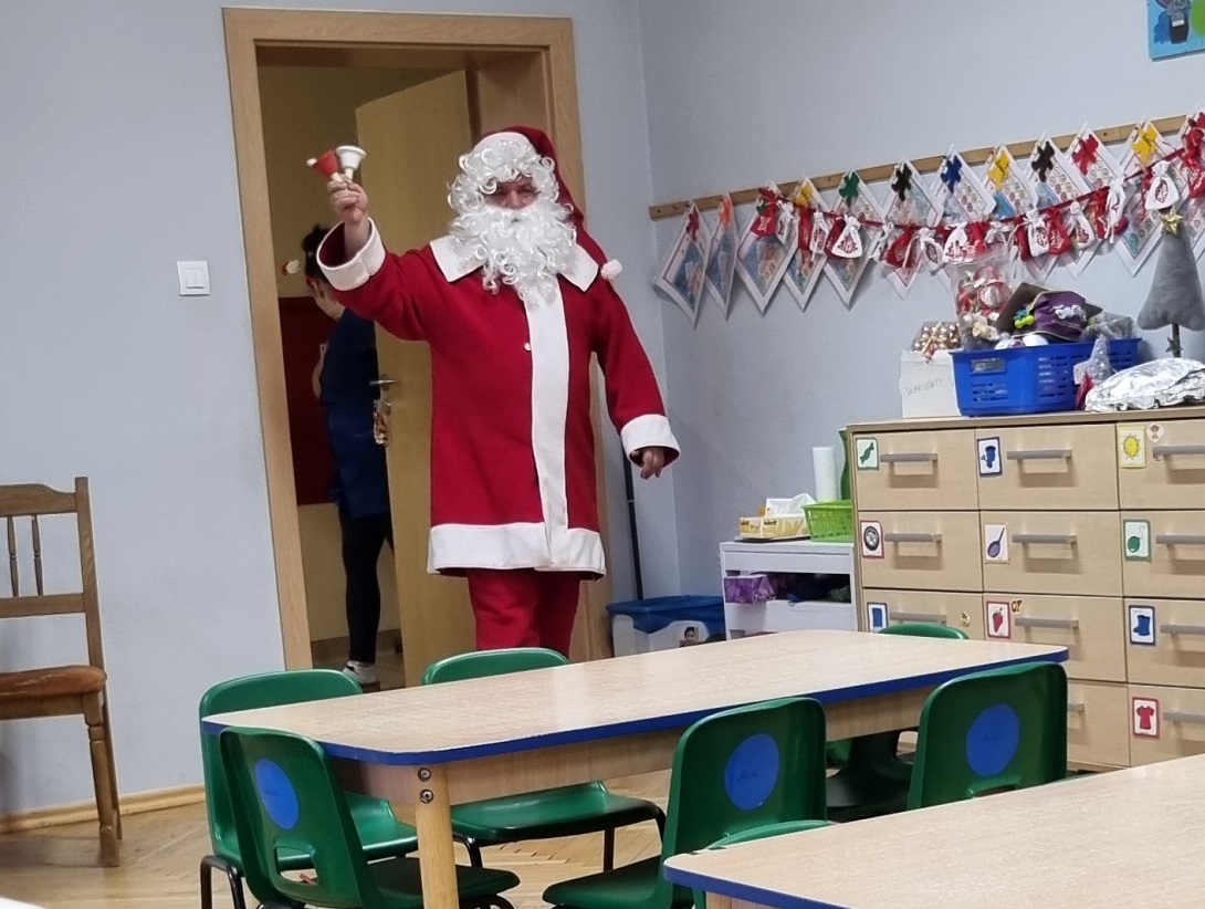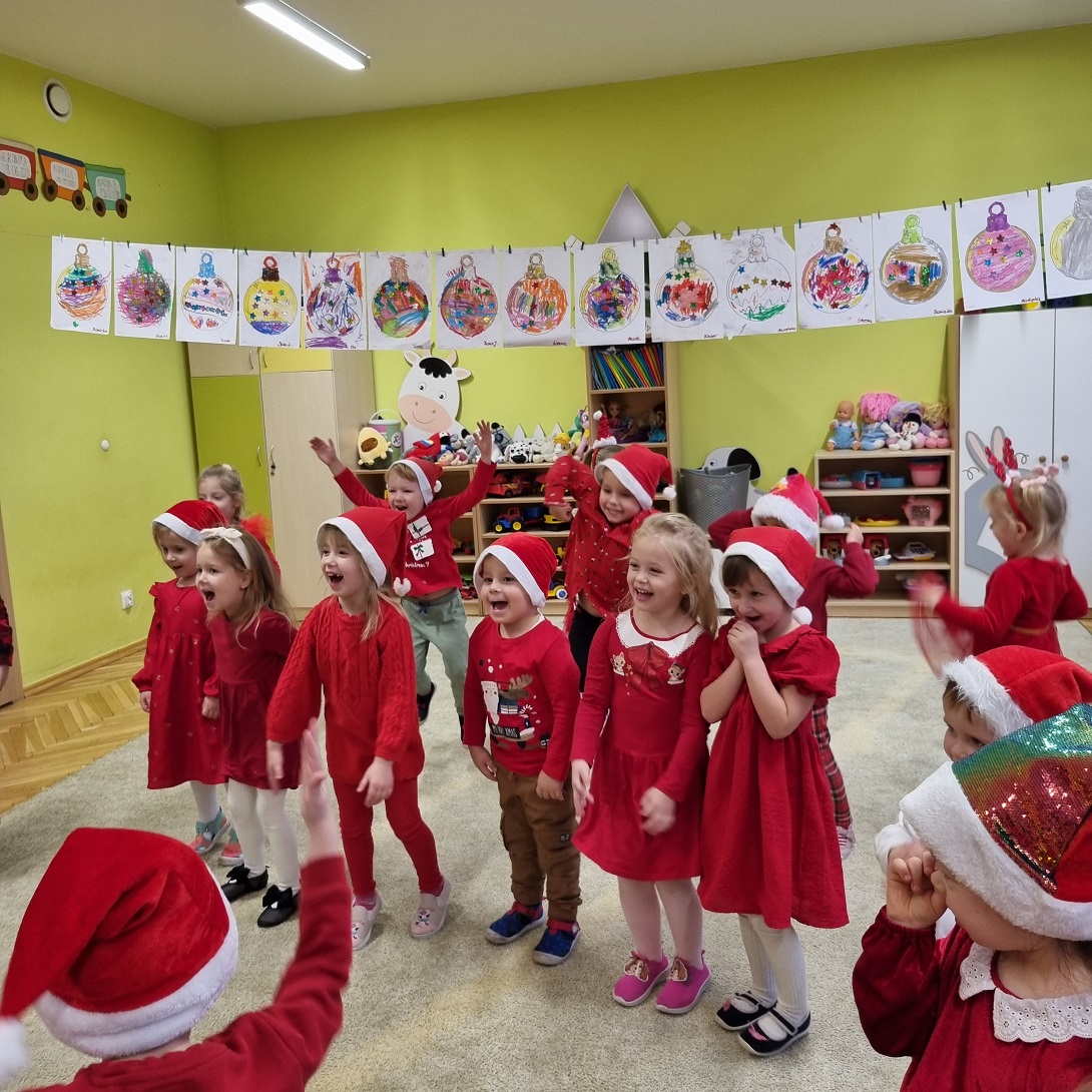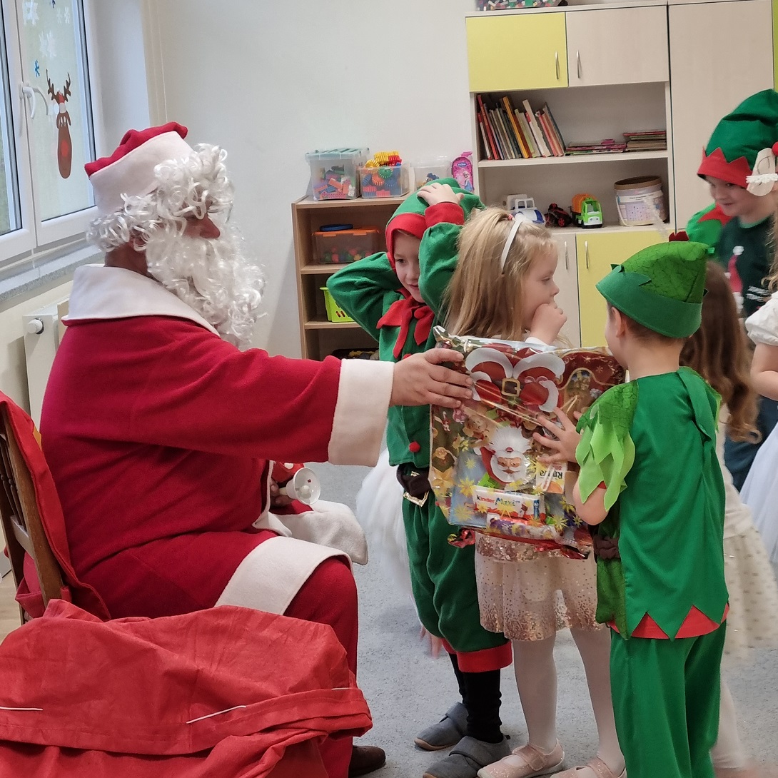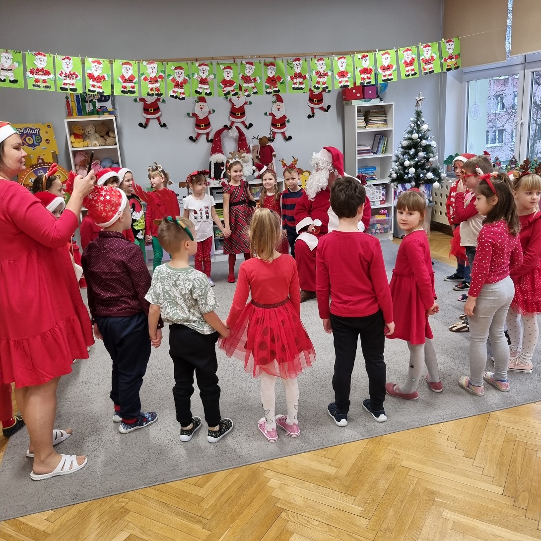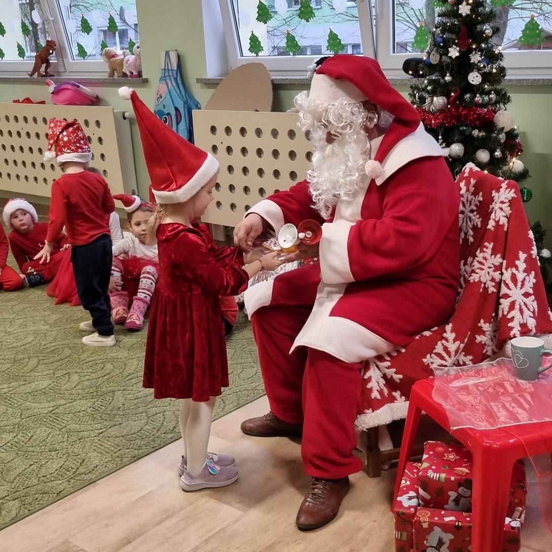 Chociaż nie było śniegu, jak co roku przybył na czas. Spotkanie przebiegało w radosnej atmosferze. Dzieci z grupy IV pod opieka pani Ani powitały niezwykłego gościai oprowadzały Mikołaja po przedszkolu. Wszystkie dzieci ubrały się na kolor czerwony, a głowy zdobiły mikołajowe czapki lub opaski świąteczne.Każda grupa przygotowała dla gościa muzyczną niespodziankę. Przedszkolaki starannie przygotowały się do wizyty Św. Mikołaja. W przedszkolu pisały lub rysowały listy, nauczyły się piosenek o Mikołaju, wykonywały prace plastyczne o tematyce świątecznej, ubierały choinkę, dekorowały salę, piekły pierniczki i wykonywały smakołyki cukierkowe.Na twarzach dzieci malował się uśmiech, przejęcie, a takze nadzieja na kolejne spotkanie. Św. Mikołaju bardzo dziękujemy za odwiedziny , podarki otrzymane od Ciebie bardzo nam podobają się. Dziękujemy za odwiedziny i do zobaczenia za rok...