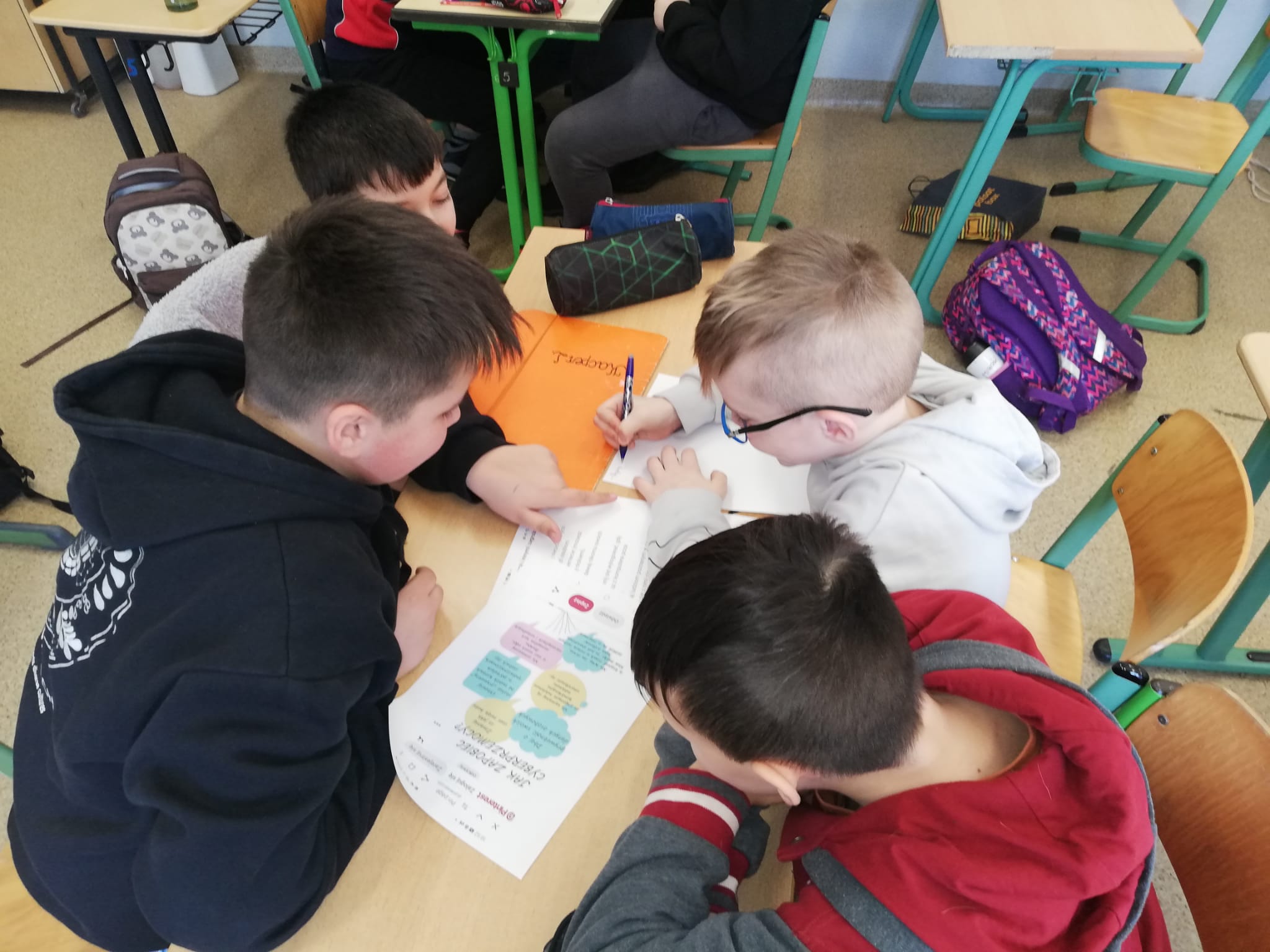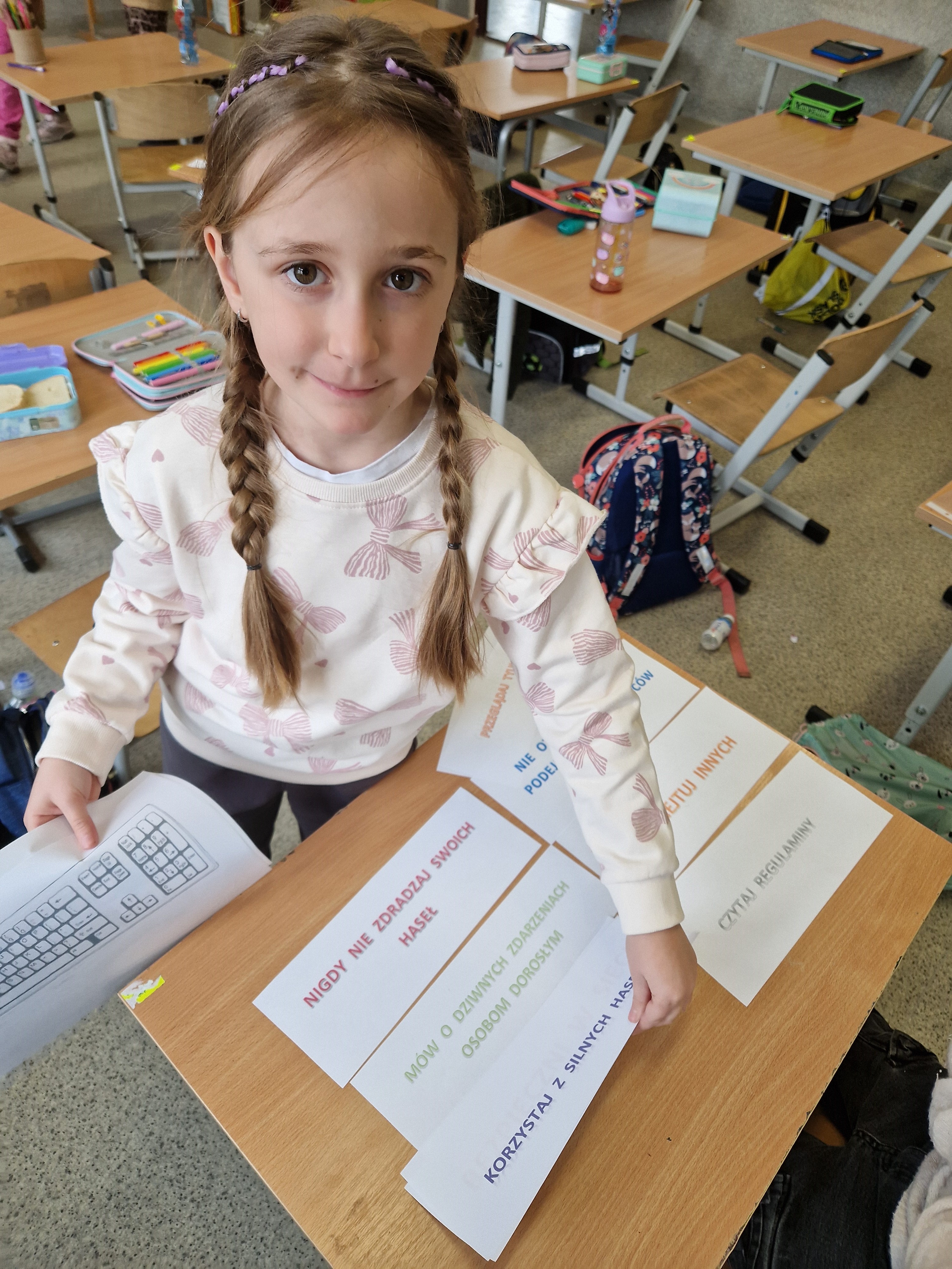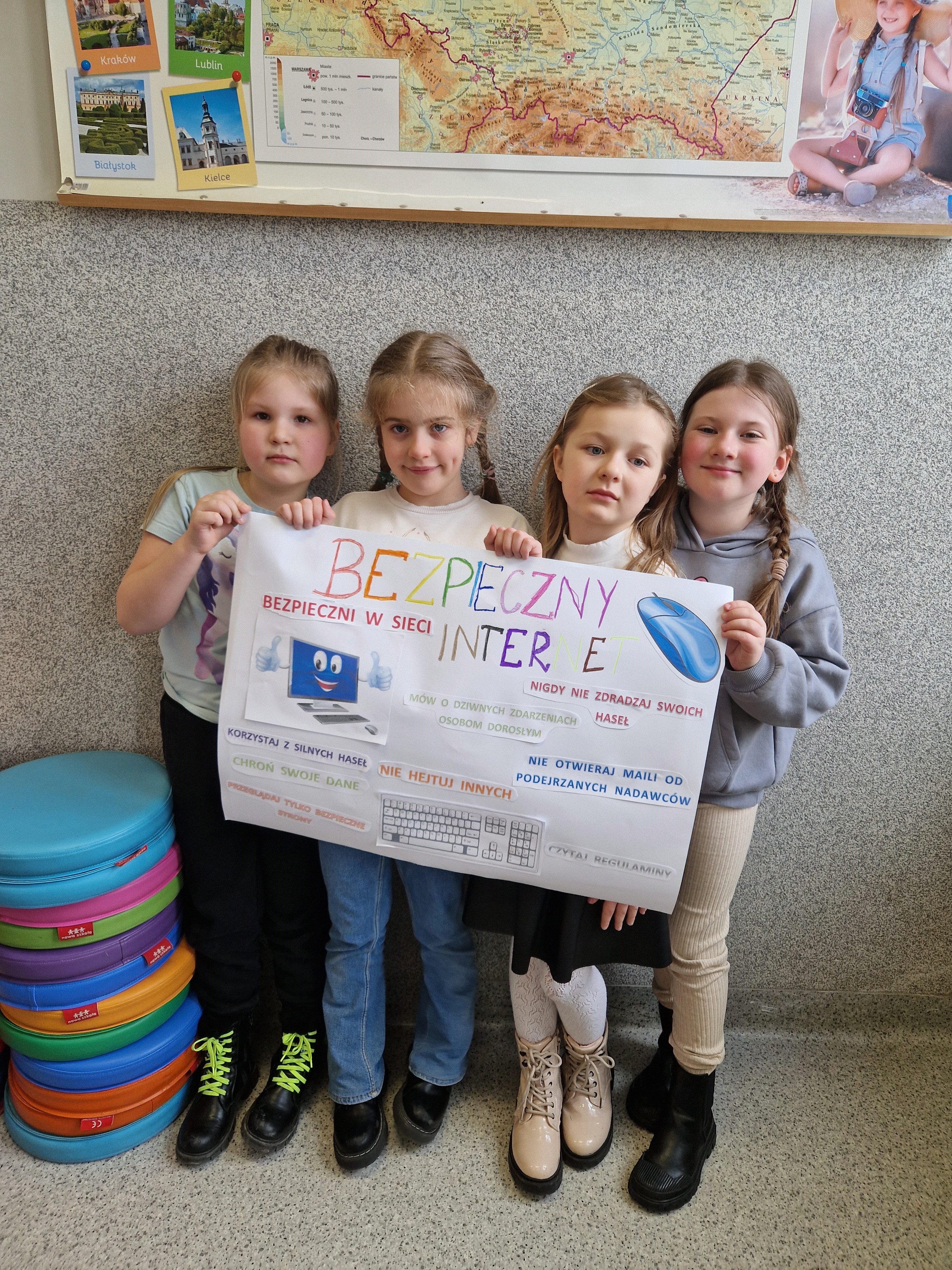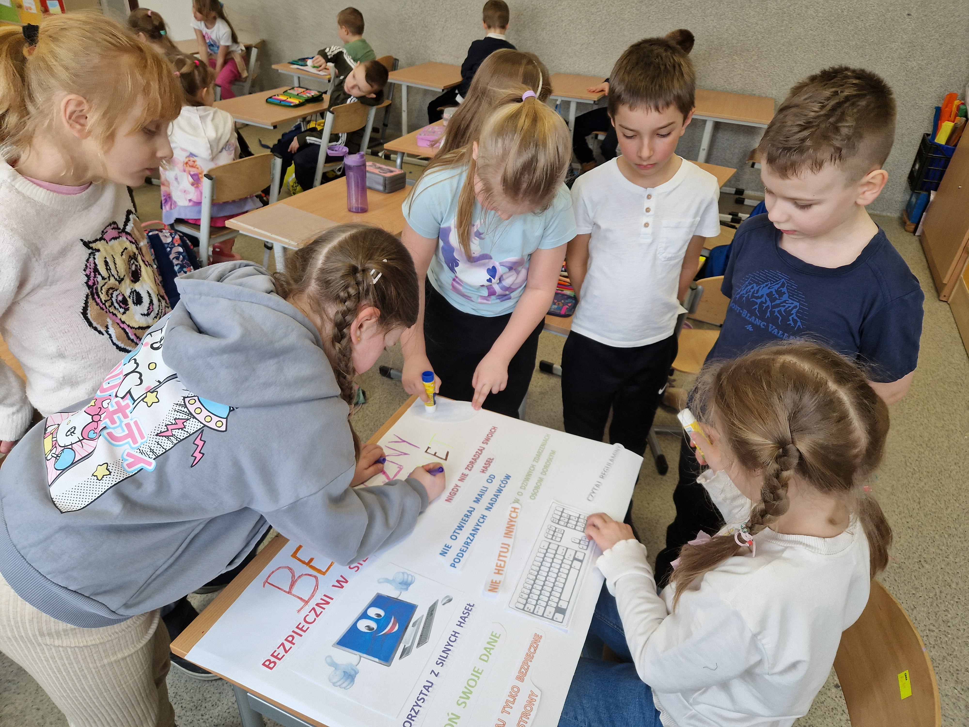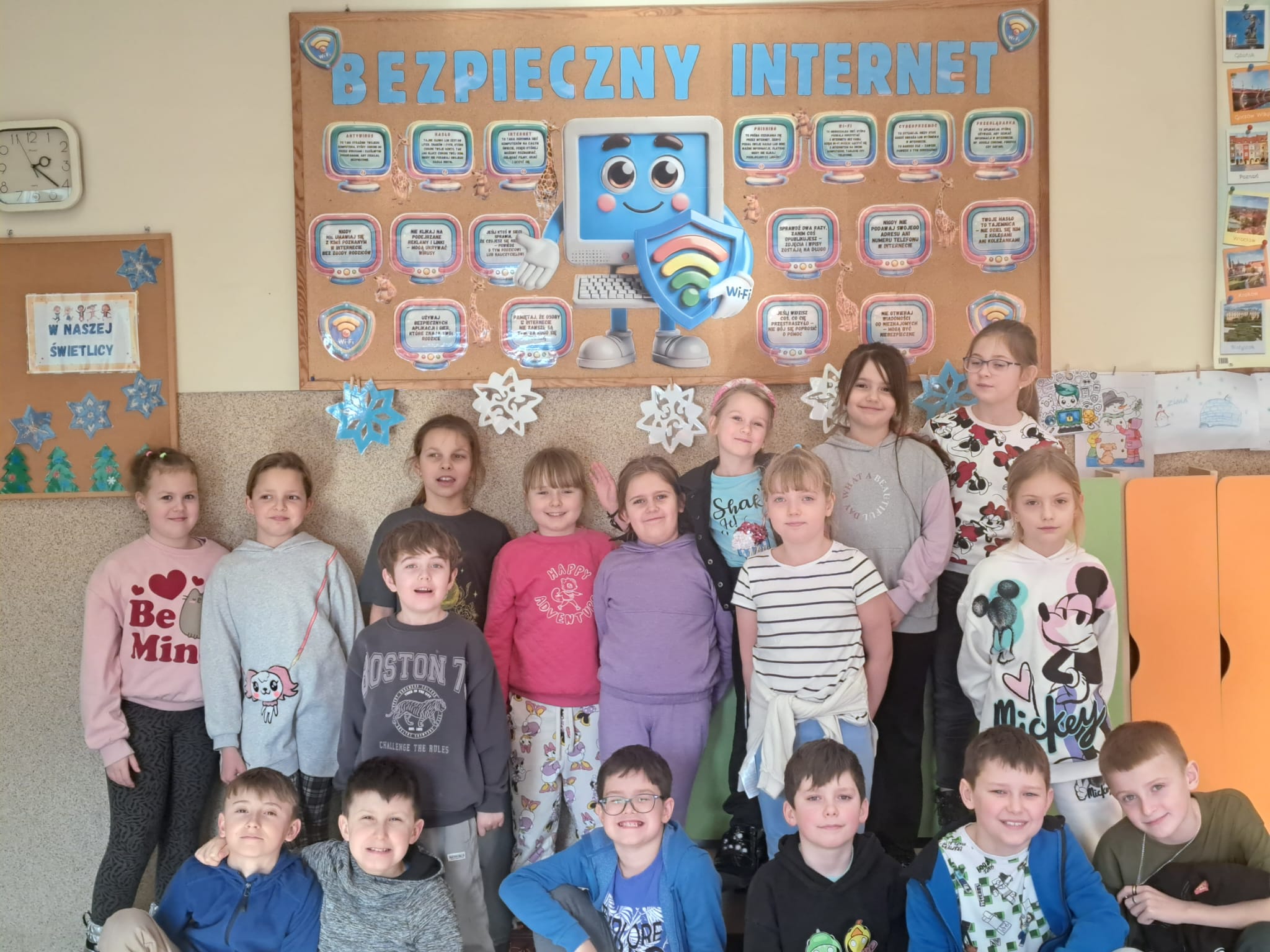 Świetlica szkolna również przyłączyła się do akcji. Celem przeprowadzonych zajęć było uświadomienie uczniom zarówno korzyści, jak i zagrożeń związanych z wirtualnym światem oraz nauczenie ich, jak unikać niebezpieczeństw. Podczas zajęć szczególną uwagę poświęcono zagadnieniu netykiety, czyli zasad kulturalnego i bezpiecznego zachowania w sieci. W trakcie spotkań uczniowie mieli także okazję zgłębić temat korzyści i zagrożeń związanych z Internetem. Z jednej strony, omówiono pozytywne aspekty, takie jak dostęp do wiedzy, możliwość komunikacji z rówieśnikami z różnych zakątków świata oraz kreatywne spędzanie czasu. Z drugiej natomiast, dzieci zostały ostrzeżone przed zagrożeniami, takimi jak cyberprzemoc, uzależnienie od Internetu oraz ryzyko kontaktu z nieodpowiednimi treściami. W celu utrwalenia zdobytej wiedzy powstała w świetlicy gazetka, zawiera najważniejsze informacje oraz wskazówki dotyczące bezpiecznego korzystania z Internetu.