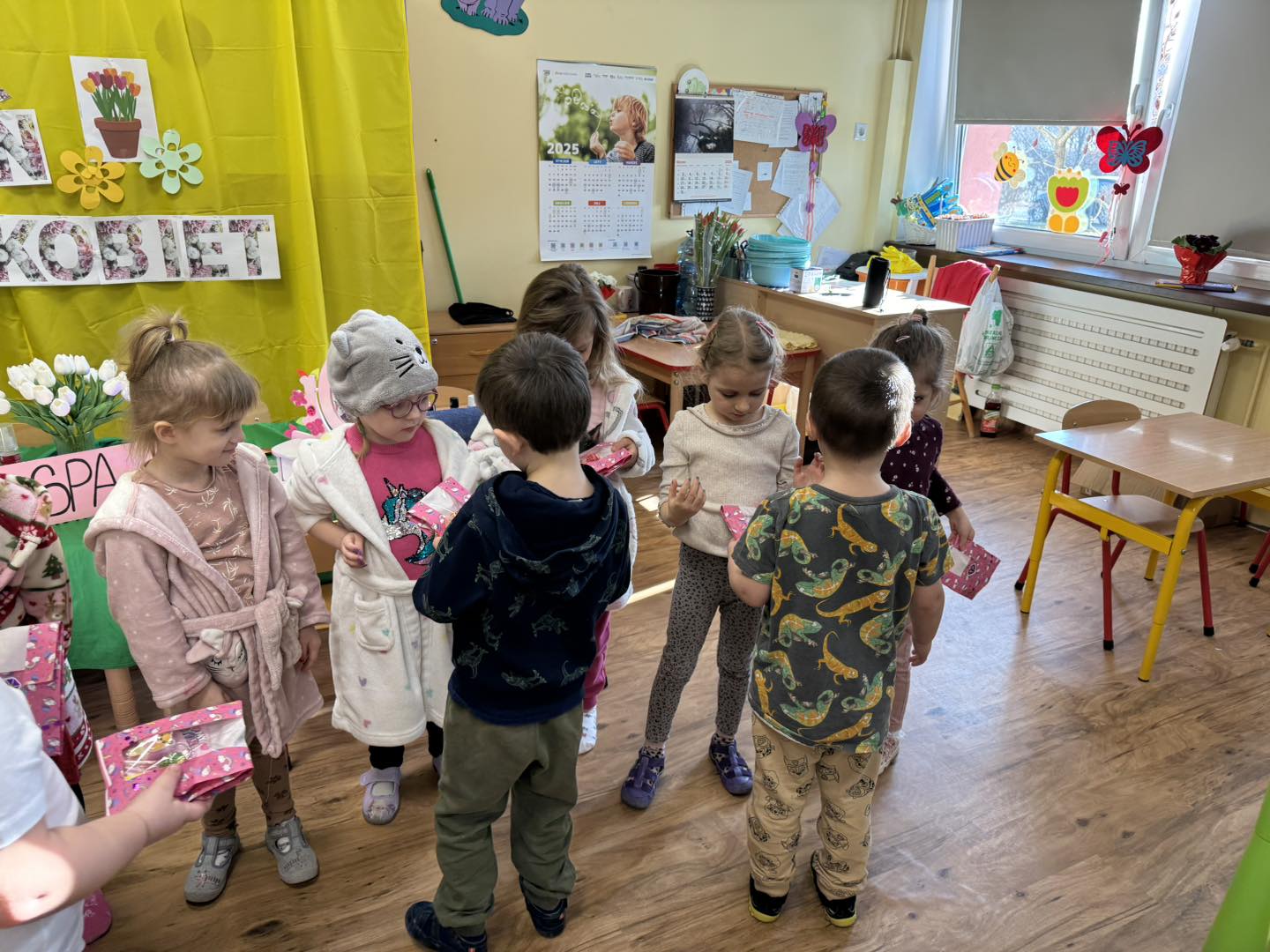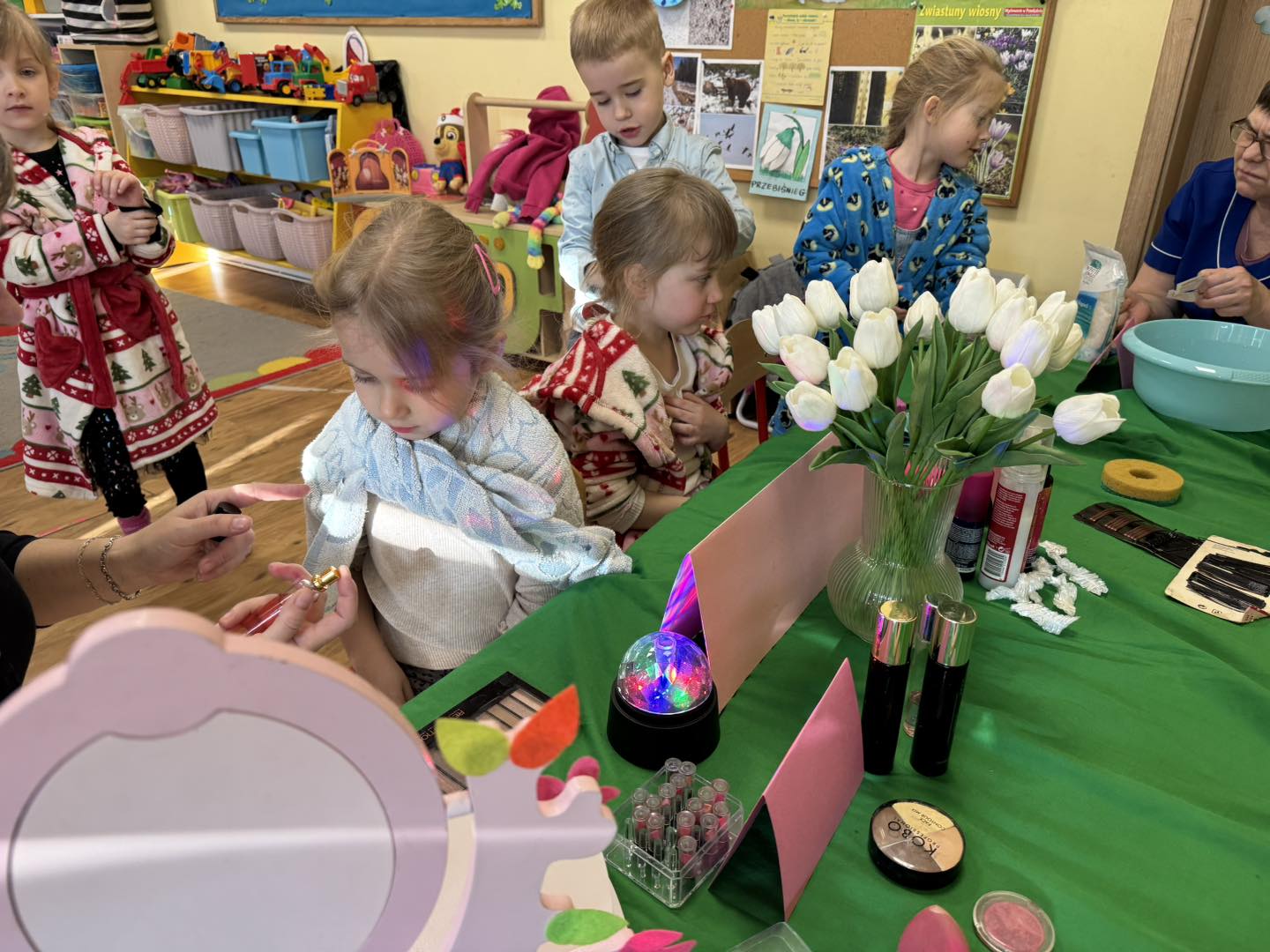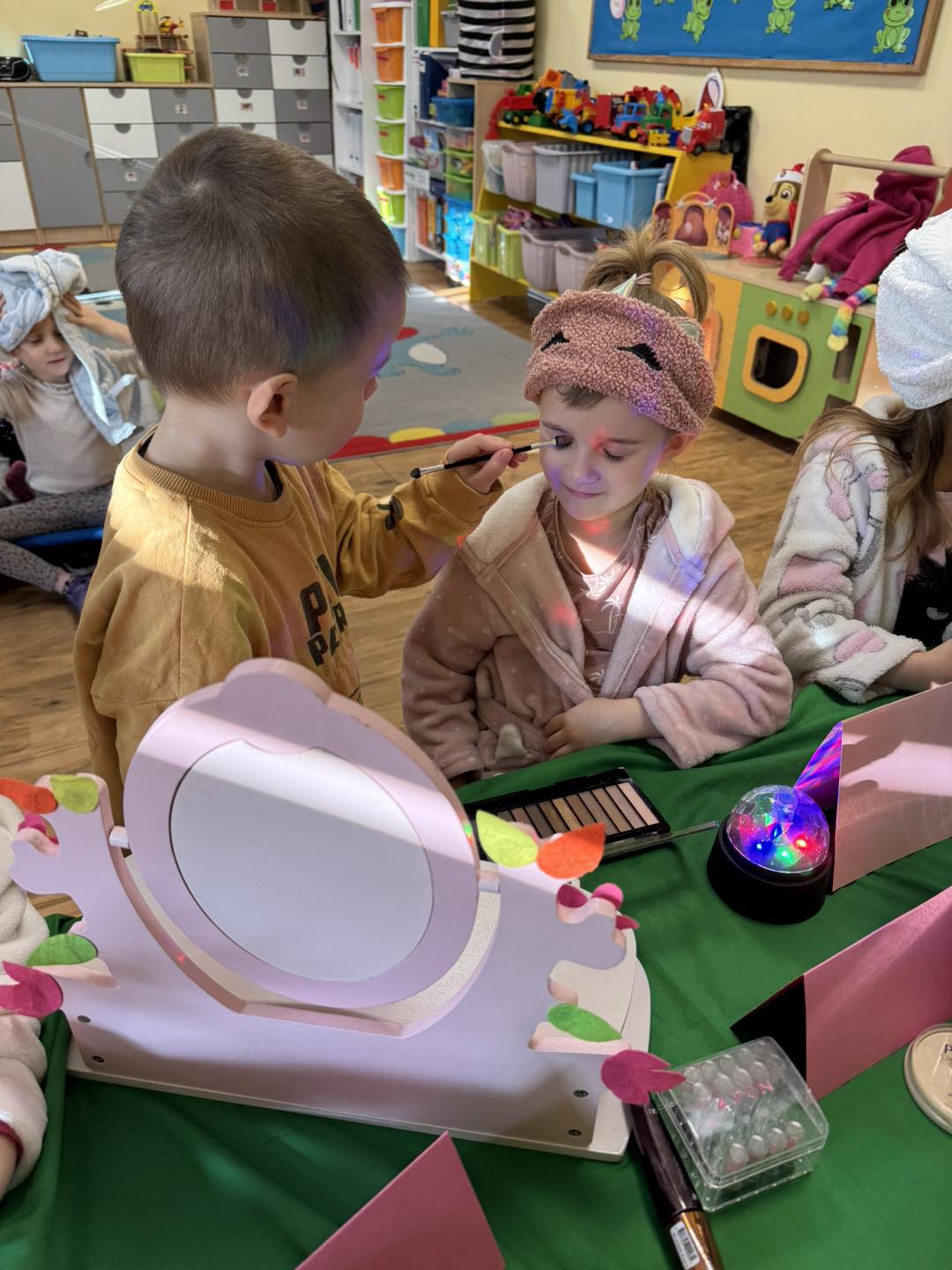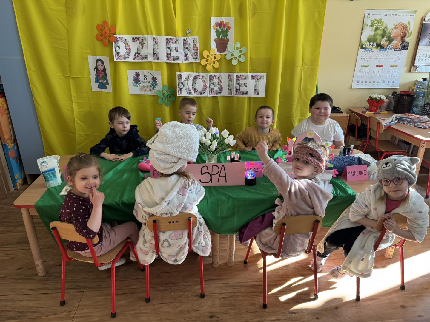 W piątek w naszym przedszkolu odbył się dzień kobiet. W każdej grupie chłopcy przygotowali dla swoich dziewczynek piękne upominki oraz poczęstunek. W grupie 4 latków dziewczynki miały okazję uczestniczyć w salonie spa i mogły poczuć się jak prawdziwe damy. Dziewczynki ubrane oczywiście w wygodne szlafroki, mogły skorzystać z manicure, pedicure, moczenia nóg w wodzie, makijażu, salonu fryzjerskiego czy też możliwości odpoczynku z okładem na oczy z ogórka.