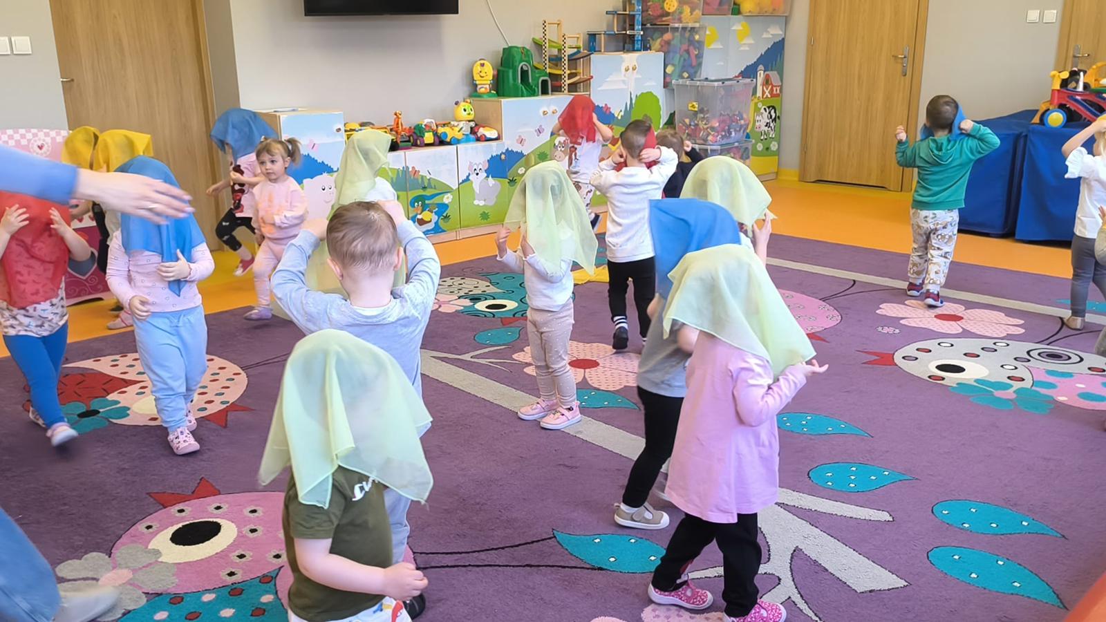 Pani Ania na zajęciach umuzykalniających pokazała nam jak nauczyć chusteczkę tańczyć. Nie było to łatwe zadanie, ale dzieci poradziły sobie świetnie.