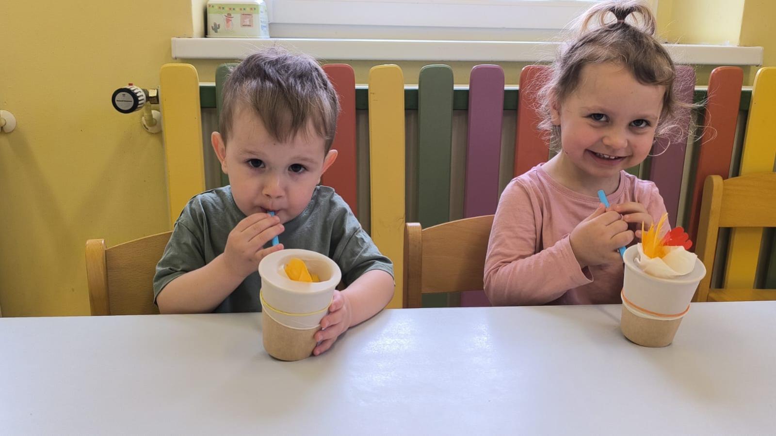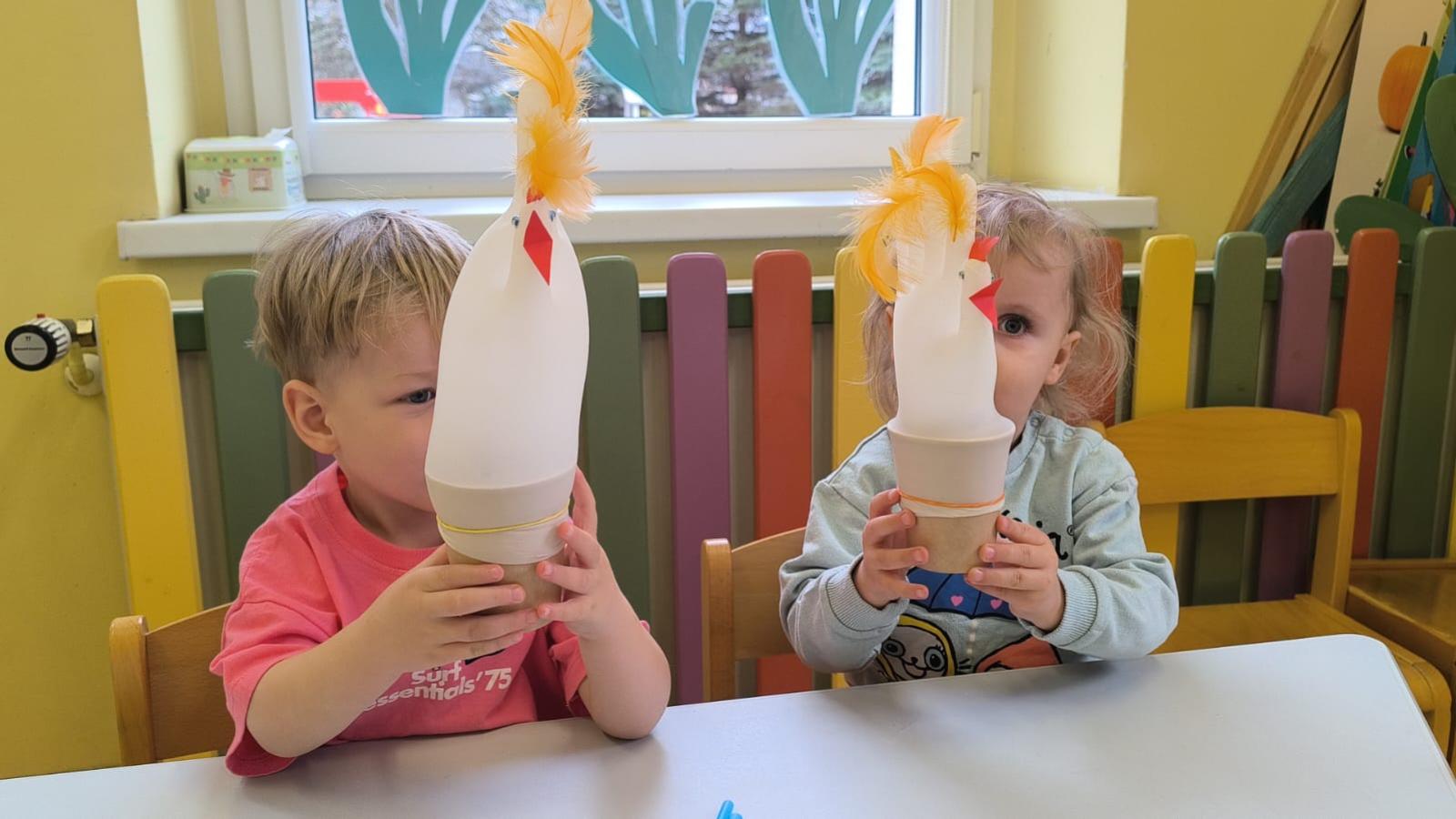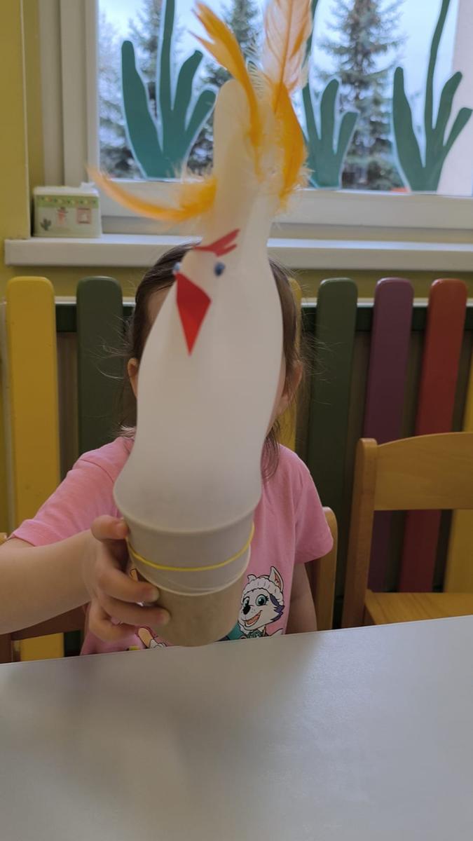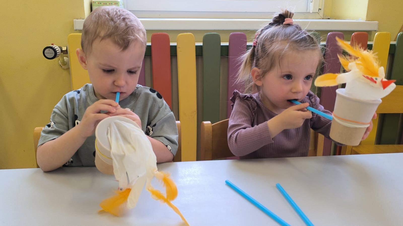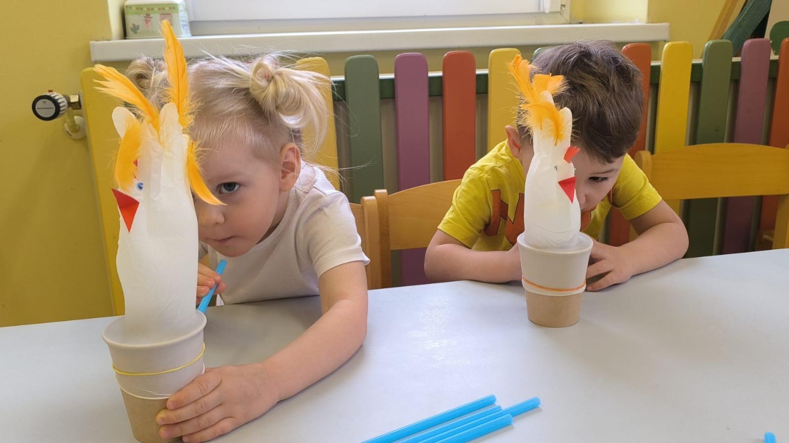 Ćwiczenia oddechowe kształtują prawidłowy tor oddechowy dziecka - Nabieramy powietrze nosem i wydychamy ustami. W kubeczku robimy niewielki otwór, następnie wkładamy w niego słomkę i nakładamy rękawiczkę. Zadaniem dziecka jest dmuchać tak aby rękawiczka się uniosła i pojawiła się kurka. Zabawa sprawiła niesamowitą frajdę dzieciom.