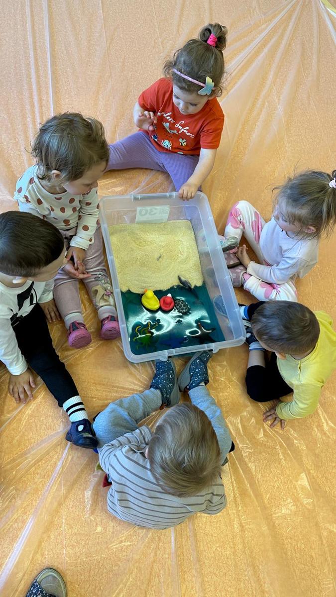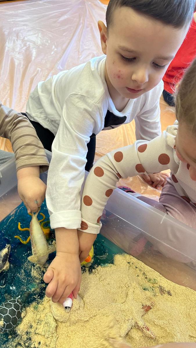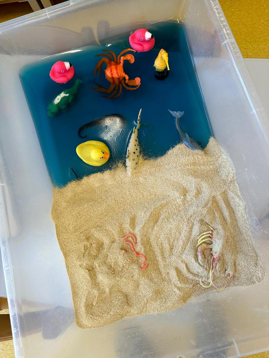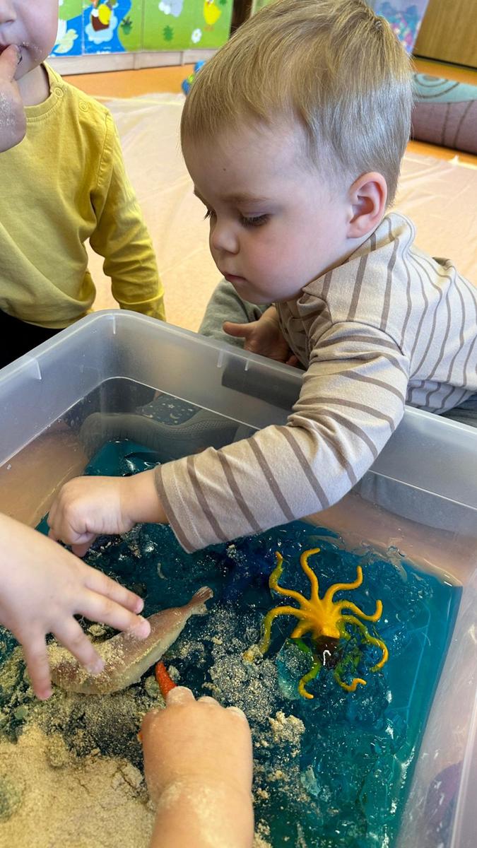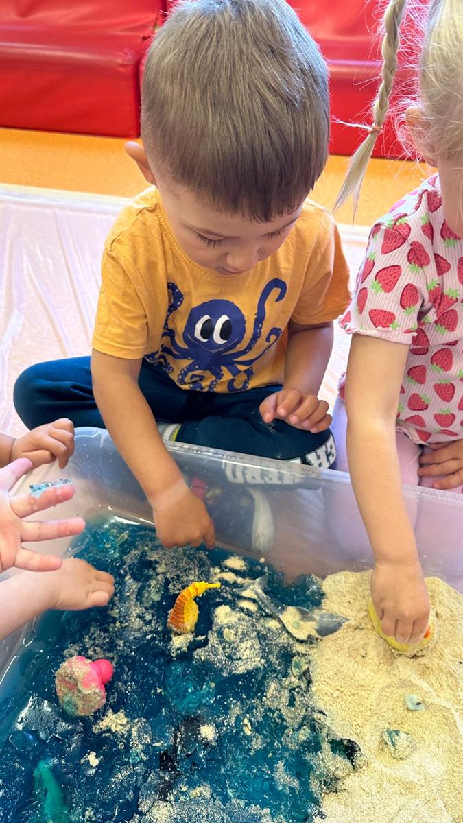 Zabawy sensoryczne pozwalają poznawać świat zmysłami. Morze z galaretki, piasek z płatków śniadaniowych. Zajęcia sprawiły wiele radości dzieciom, mogły ugniatać, mieszać i przede wszystkim próbować. Było pysznie.