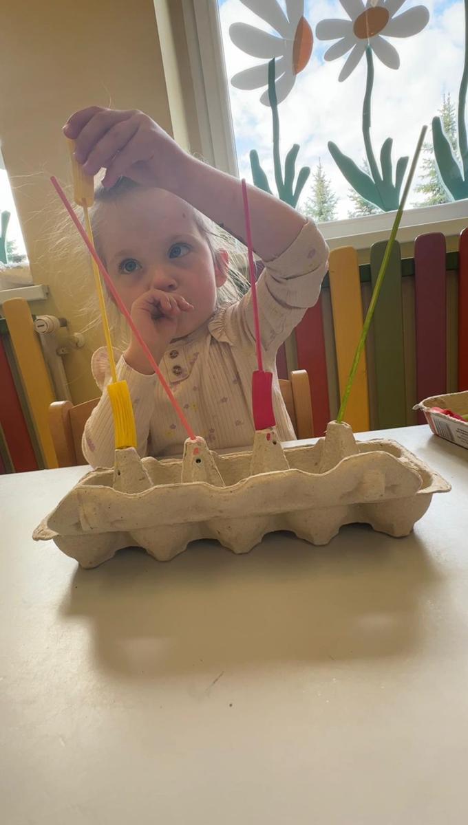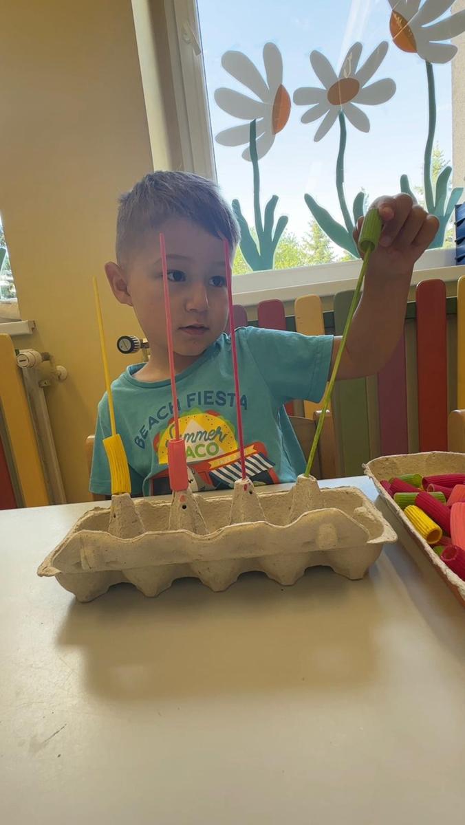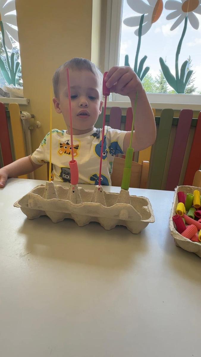 Nauka kolorów jest związana z rozwojem spostrzegania wzrokowego. Zabawa polega na nawlekania kolorowego makaronu na odpowiedni patyczek, a ma na celu ćwiczenie motoryki małej, rozwijanie logicznego myślenia, a przede wszystkim utrwalenie kolorów.