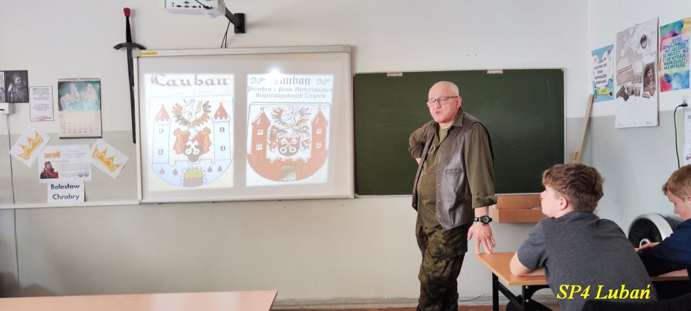 Trzecim punktem spotkania była prelekcja historyczna pt. „Herb Lubania poprzez wieki”, będąca wręcz nagrodą dla wszystkich zgromadzonych. Pan Piotr Kucznir, który jako prezes ŁTH Zamku Czocha przybył do naszej szkoły z darem w postaci projektora, zamienił się bowiem w prelegenta, który w ciekawy i rzetelny sposób zaznajomił uczestników spotkania z ogólnymi zasadami heraldyki oraz początkami i zmianami jakimi ulegał nasz herb historyczny – Herb Miasta Lubania. Próżno szukać w czeluściach Internetu wielu informacji o naszym herbie, dlatego nasza młodzież z zaciekawieniem i uwagą słuchała słów prelegenta, a całość spotkania stała się nie tylko lekcją historii, ale również lekcją regionalizmu i kształtowania patriotyzmu lokalnego na najwyższym poziomie.