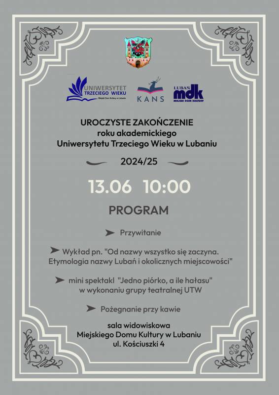 Zapraszamy na uroczyste zakończenie roku akademickiego 2024/2025, które odbędzie się 13 czerwca na sali widowiskowej Miejskiego Domu Kultury w Lubaniu.