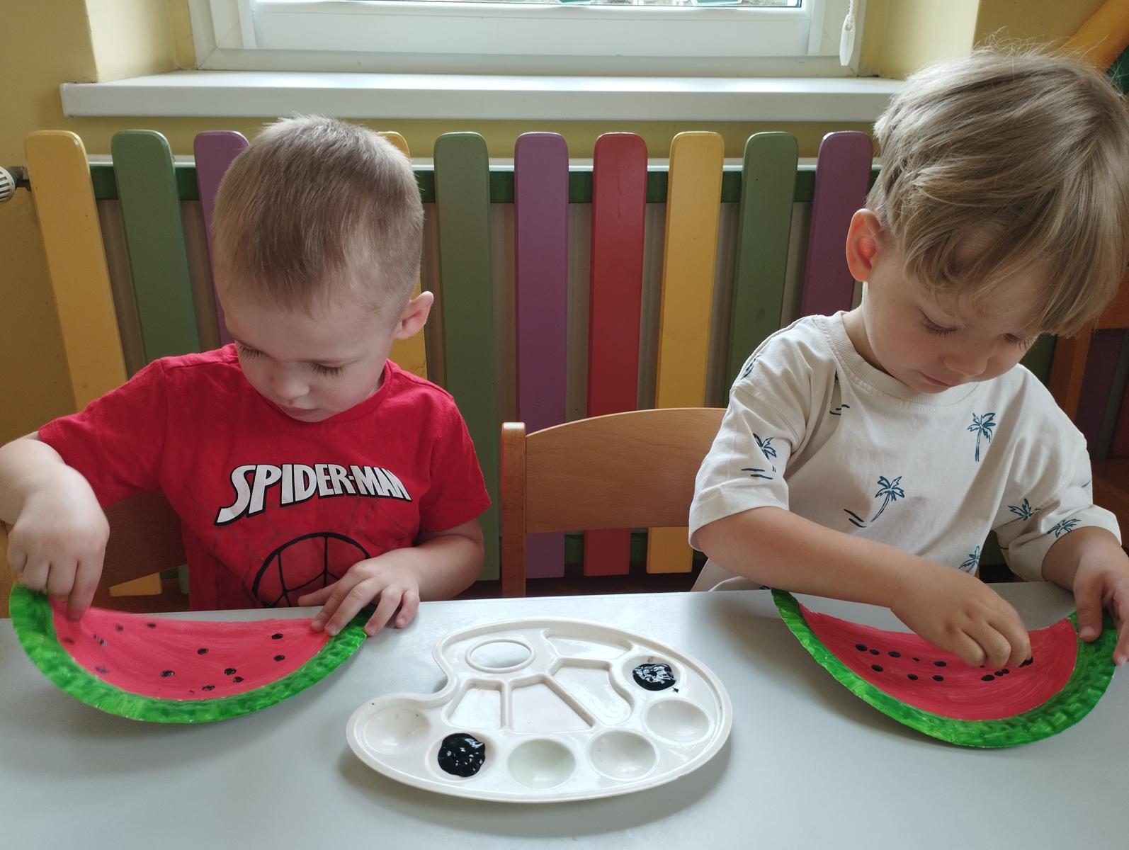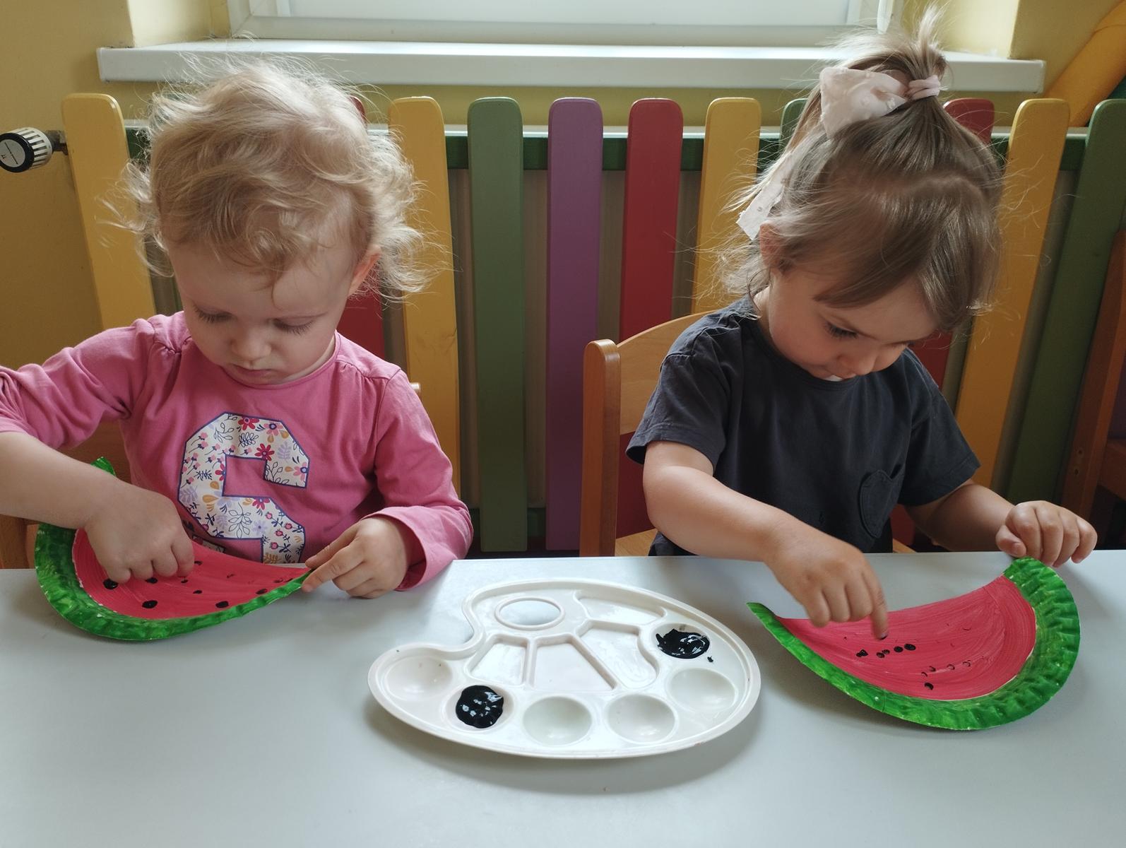Na zajęciach plastycznych dzieci wykonywały pracę przedstawiającą kawałek arbuza. Do jej wykonania potrzebowały papierowych talerzyków i farb. Arbuzy wyszły pięknie i smacznie. Pracę można podziwiać na wystawie w szatni żłobkowej.