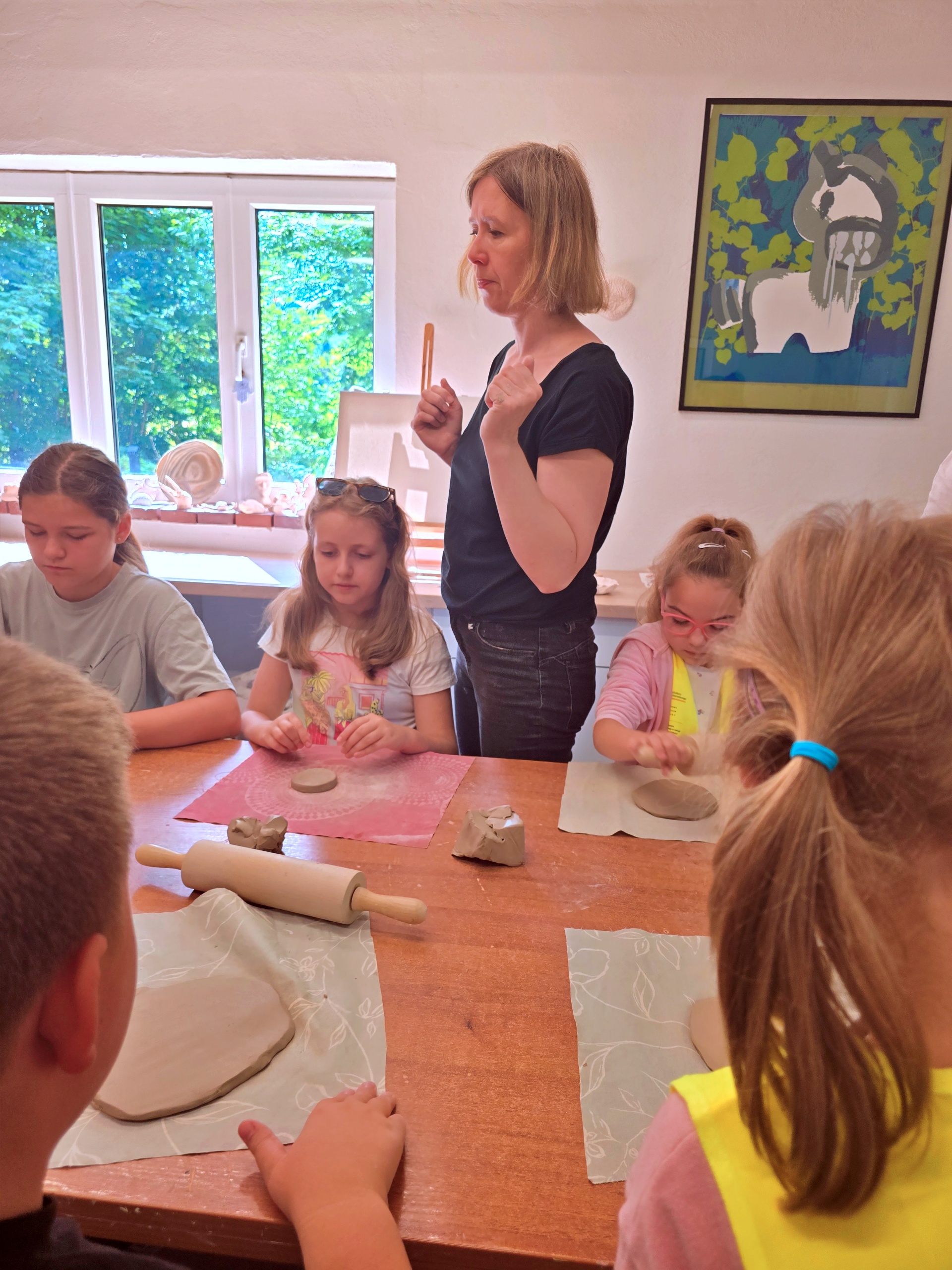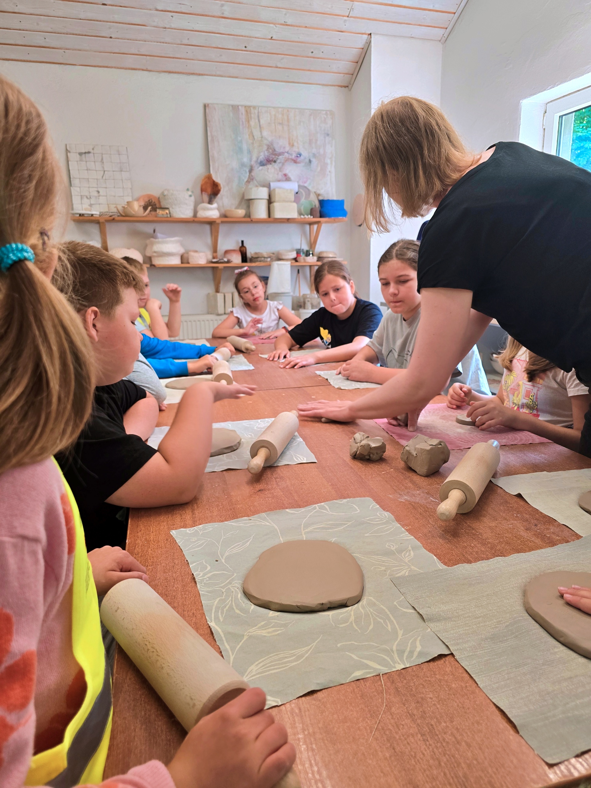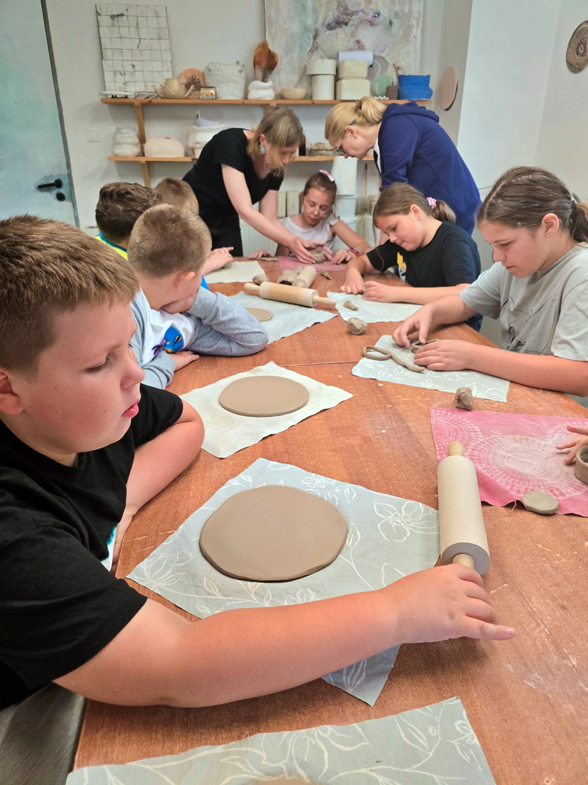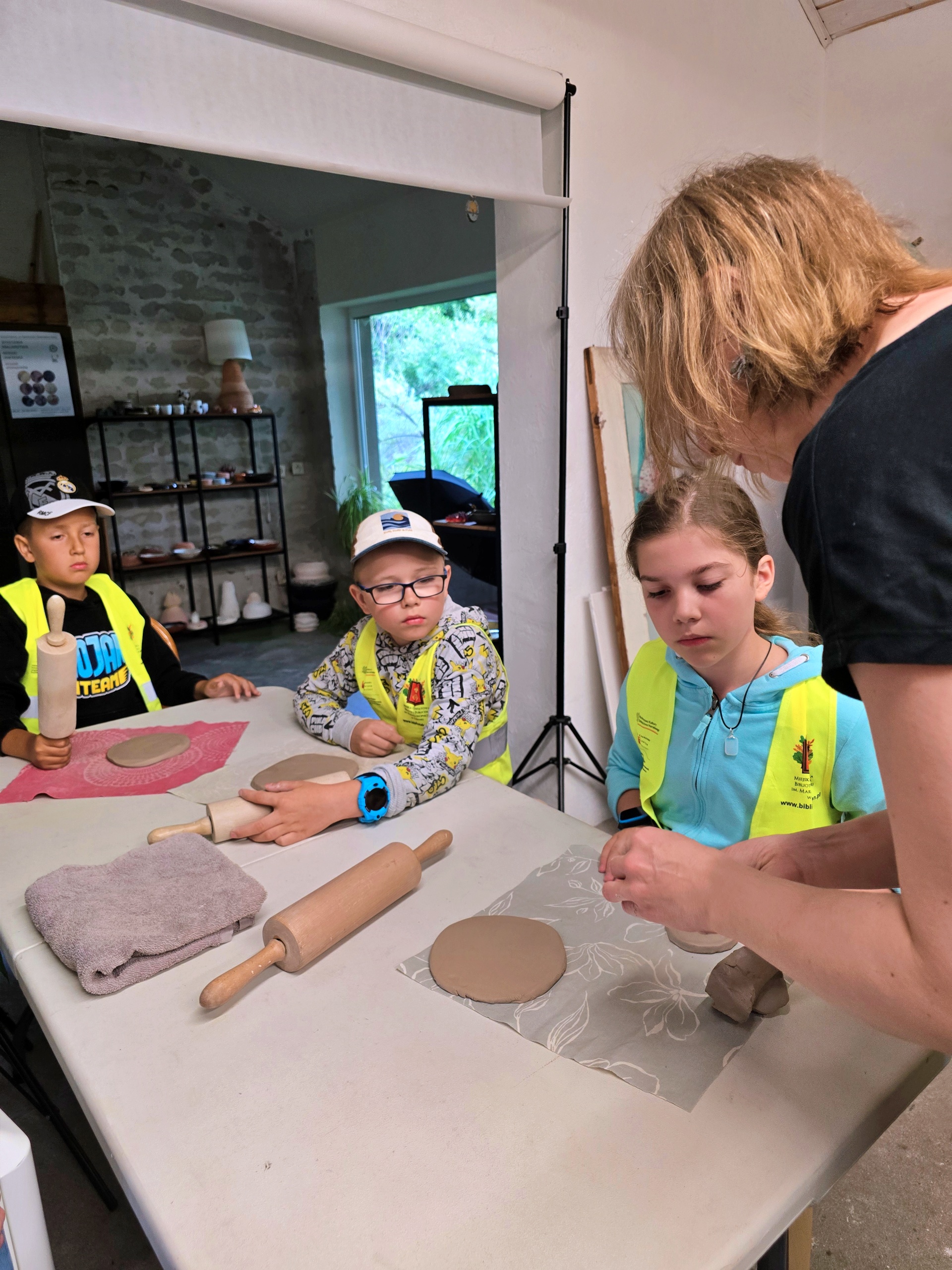 Wakacyjna wyprawa rozpoczęła się od wizyty w ceraMonic – kameralnej pracowni ceramicznej, położonej w otoczeniu zieleni. Podczas warsztatów pani Monika opowiedziała o pochodzeniu wykorzystywanej gliny, zwracając uwagę na jej lokalne źródło – kaolin z okolic Nowogrodźca.