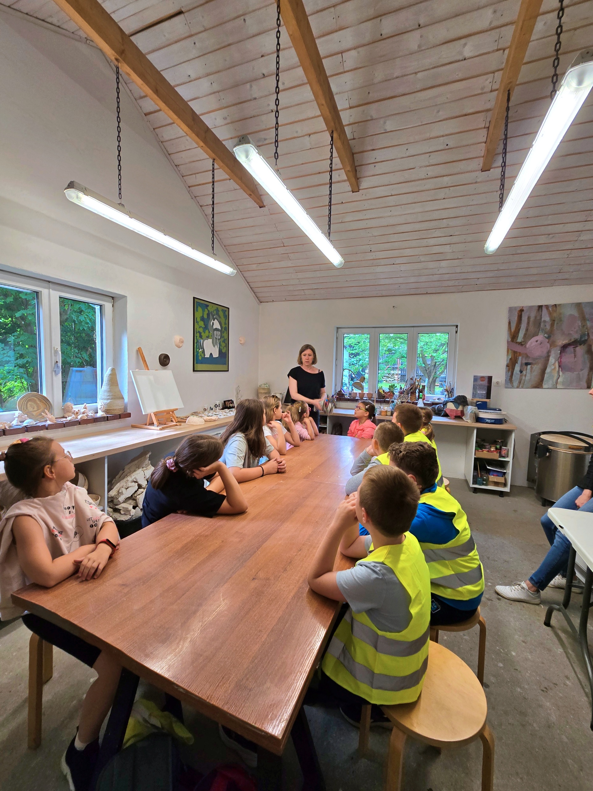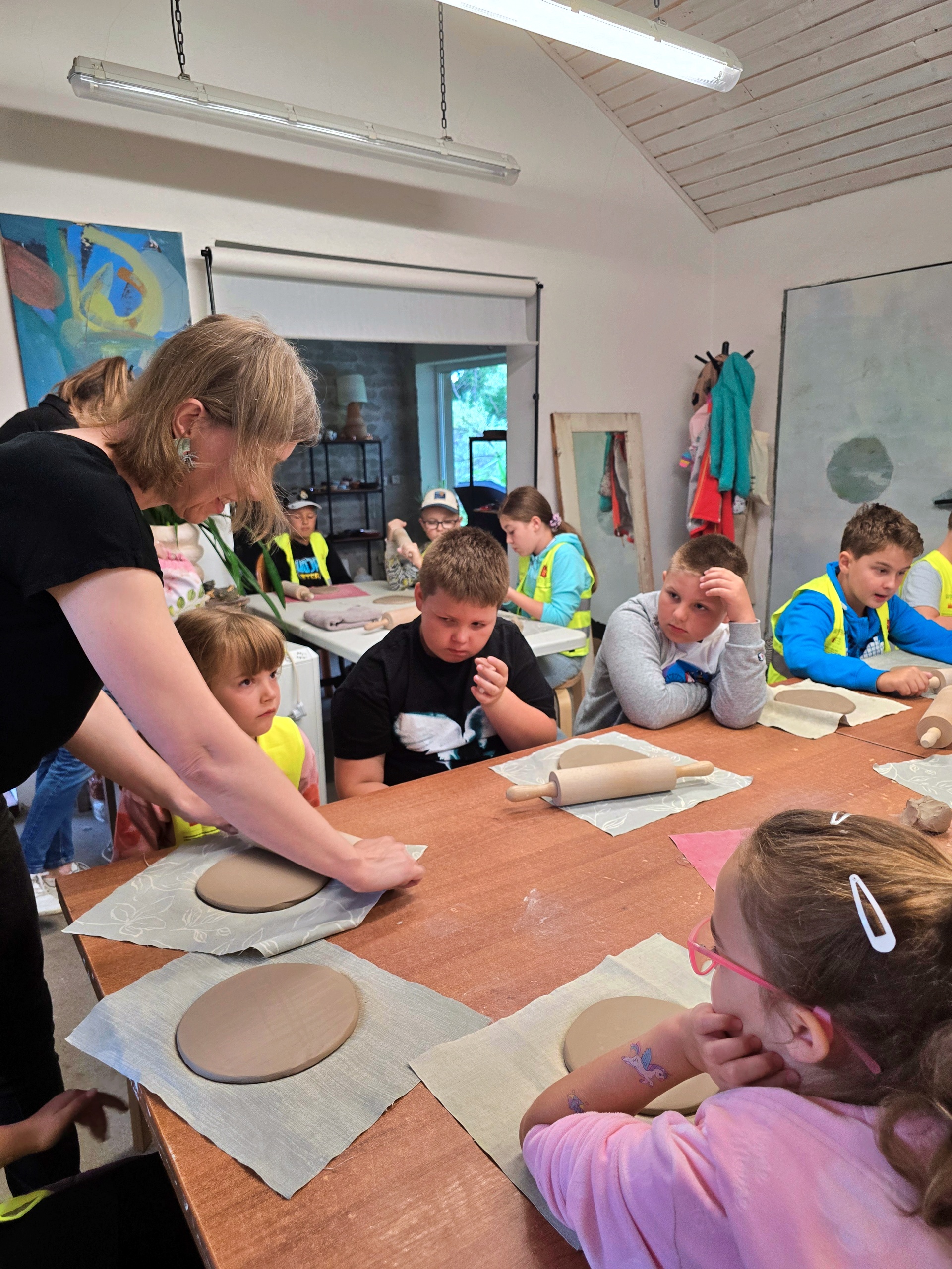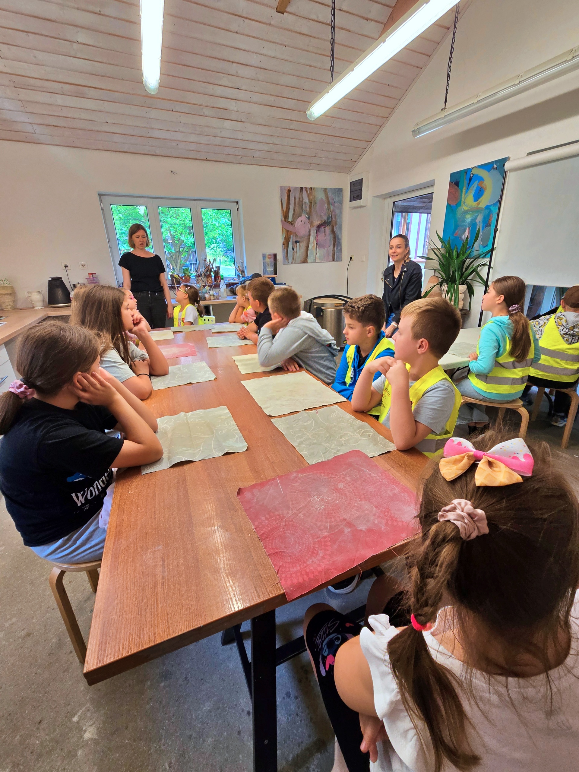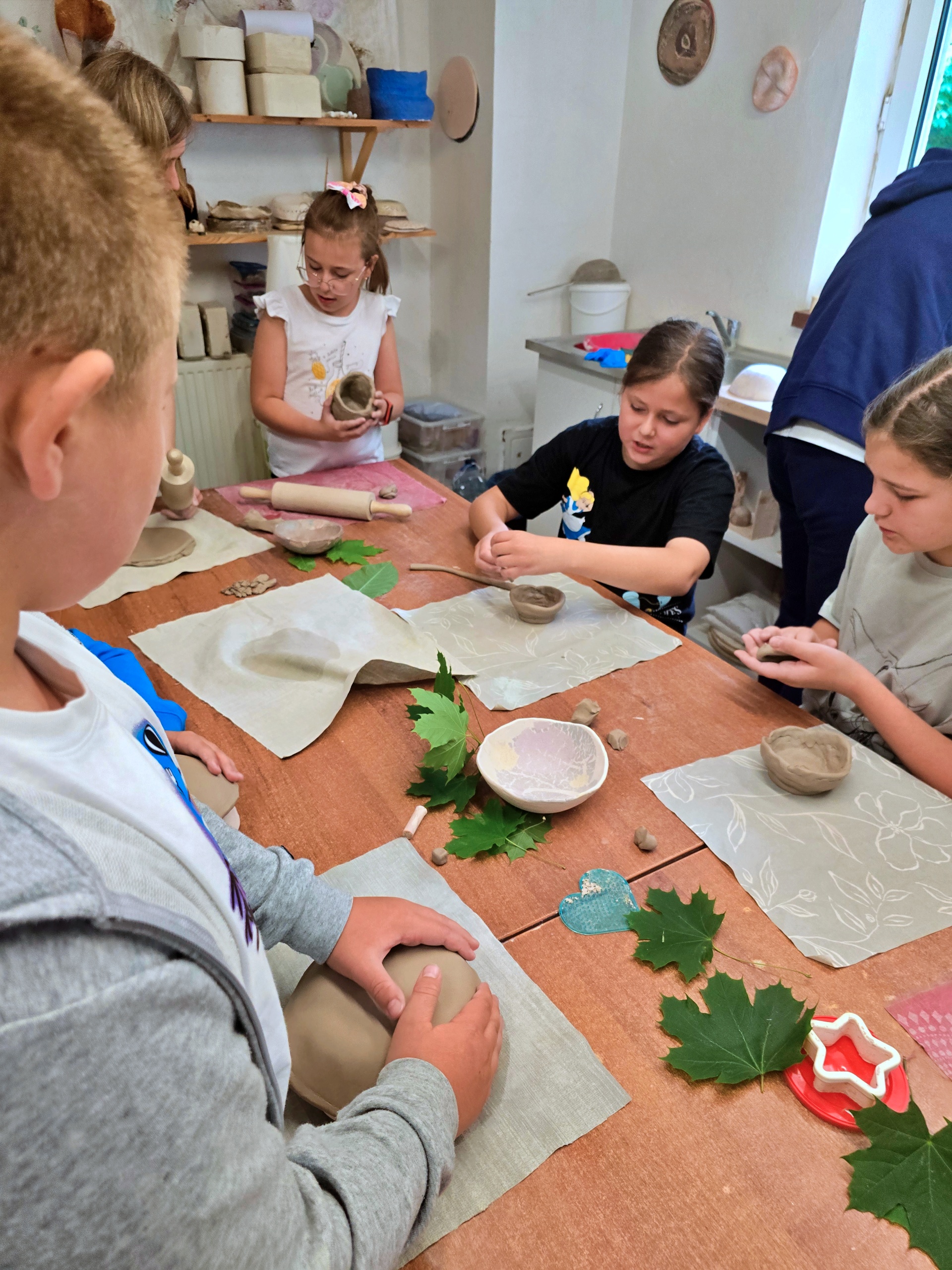 Wakacyjna wyprawa rozpoczęła się od wizyty w ceraMonic – kameralnej pracowni ceramicznej, położonej w otoczeniu zieleni. Podczas warsztatów pani Monika opowiedziała o pochodzeniu wykorzystywanej gliny, zwracając uwagę na jej lokalne źródło – kaolin z okolic Nowogrodźca.